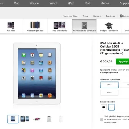 Tablet di qualità a prezzi abbordabili a partire da 259 euro con gli iPad ricondizionati di Apple Store online. Sconti che arrivano fino al 48% per iPad 3 16 GB Retina Wi-Fi + cellular a 309 euro