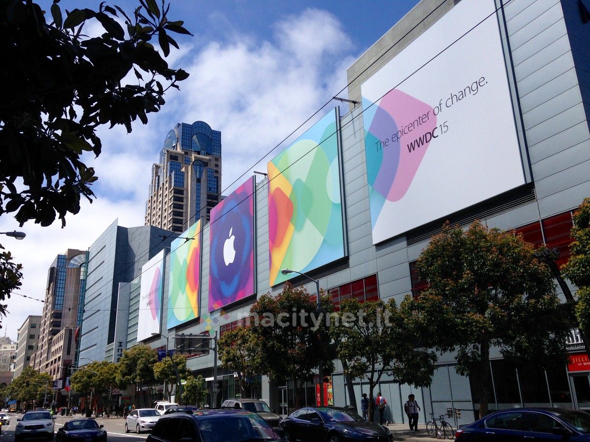 Le decorazioni del centro congressi del Moscone in vista dell'apertura della conferenza mondiale degli sviluppatori Apple sono pronte. Ecco alcune immagini della struttura che ospiterà la WWDC 2015