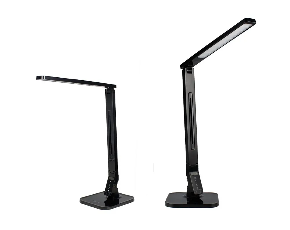 Appena sopra si trova il pannello dei comandi di tipo touchscreen, con quattro pulsanti per definire la tipologia della luce, due per l’intensità, uno per l’accensione e stand-by e uno per il timer. Lo snodo appena superiore fornisce l’altezza della lampada, che comprensiva di base arriva a 46 cm e mantiene la barra che ospita le tre serie di LED nello snodo successivo, che porta alla lunghezza di 35 cm. Nella parte superiore sono ospitate tre file di LED, per un totale di 27 piccole luci che forniscono una illuminazione totale di 530Lm, ideale per uno studio o una camera: il costruttore assicura che, se utilizzata con una media di 5 ore al giorno, garantiscono una durata di 22 anni con un consumo del 75% inferiore ad una lampadina a fluorescenza.