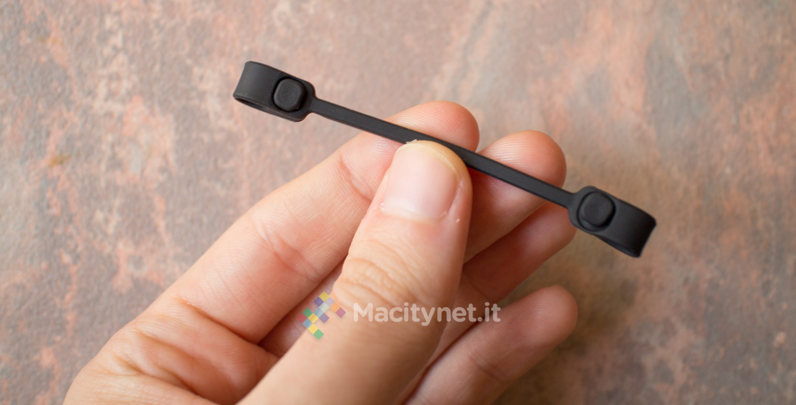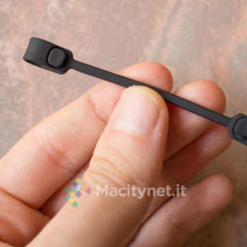 Se la lunghezza del cavo, di circa 30 centimetri, risulta troppa, entra in gioco un pratico accessorio, una sorta di elastico, realizzato nella stessa gomma, pensato proprio per “accorciarlo” ed evitare di appesantire le cuffie durante l’uso. In breve si aggrappa ai due lati del cavo e lo si fa scorrere fino alla nuca, migliorando così la stabilità delle cuffie che restano immobili anche con salti e capriole.