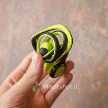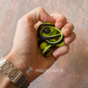 Il cavo è quasi totalmente morbido e flessibile eccezion fatta in prossimità degli auricolari, dove avvolgono un archetto rigido, probabilmente in plastica, che migliora la stabilità delle cuffie nelle orecchie senza fastidi. L’alta stabilità del sistema è garantita anche da questi uncini che, non essendo molli come il cavo, restano in posizione e non appesantiscono le cuffie anche quando le si indossano per più ore consecutive.