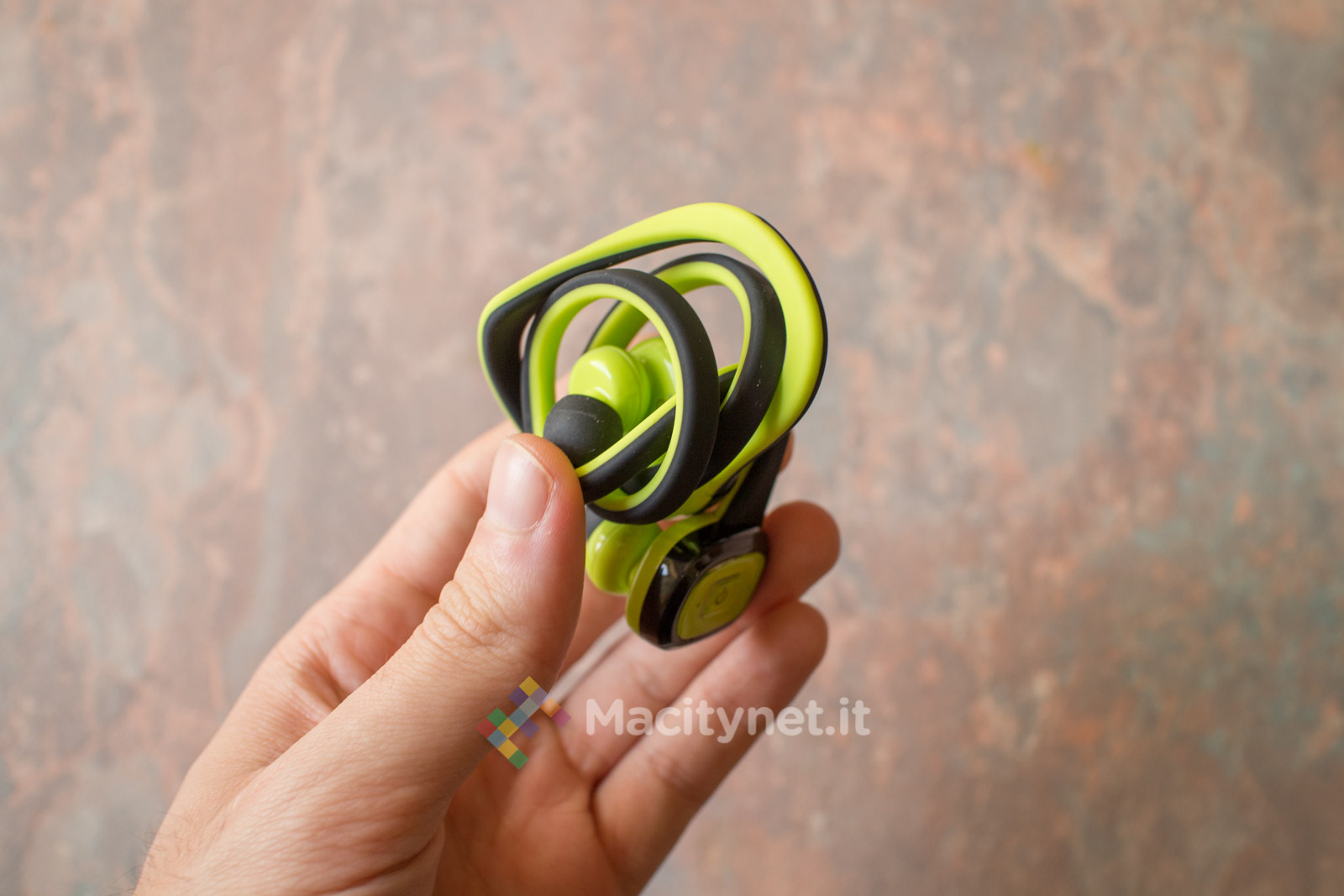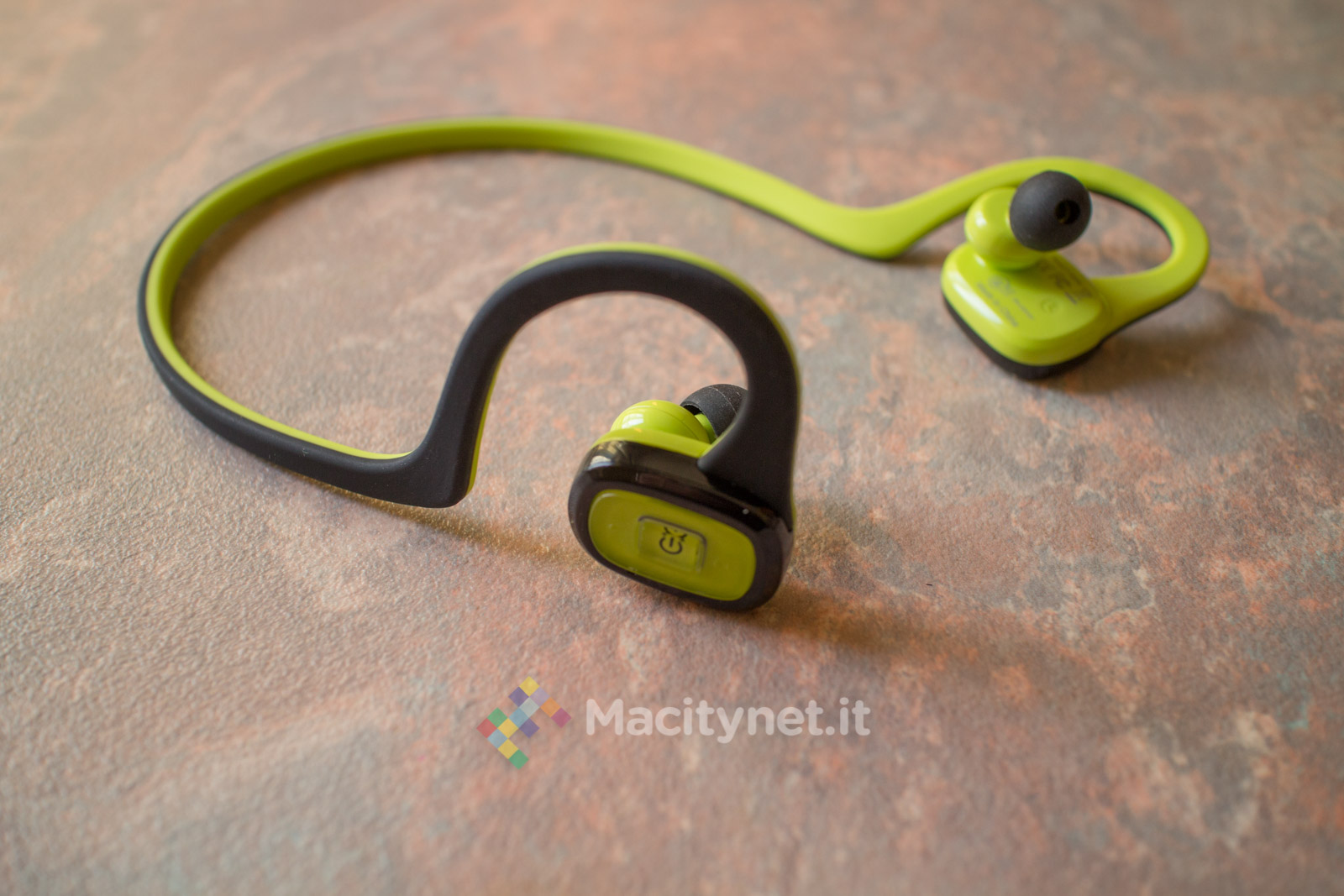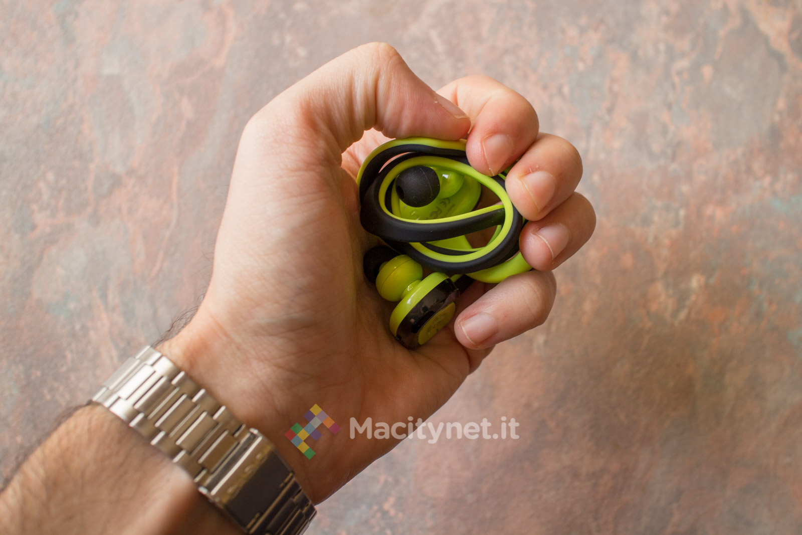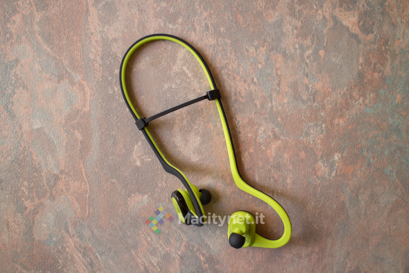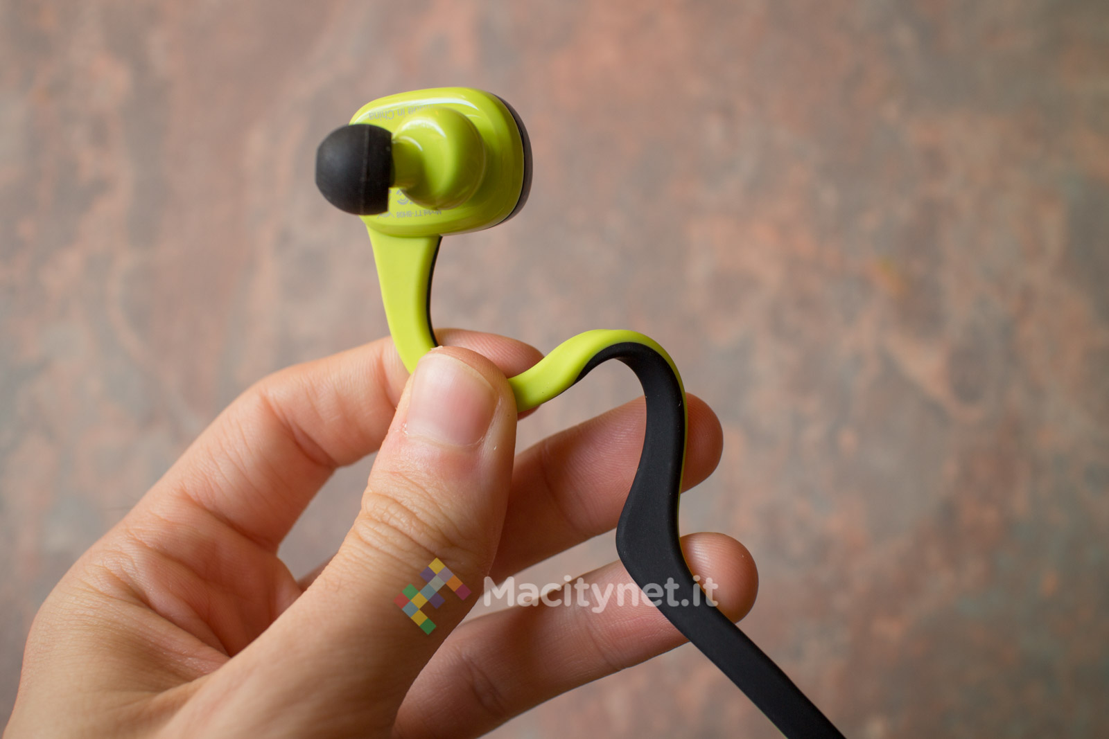Rispetto ad altre di questo genere ci sono sembrate molto più comode e leggere per via della morbida gomma che riveste il cavo, oltre al sistema ad archetto che migliora la stabilità degli auricolari nelle orecchie. Uno dei punti di forza è nel laccio che le lascia aderire perfettamente alla nuca, così non scivolano via e non saltellano neanche durante una corsa intensa.