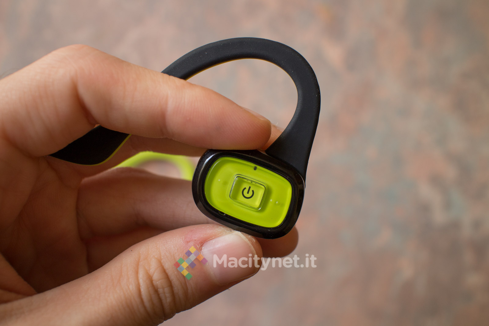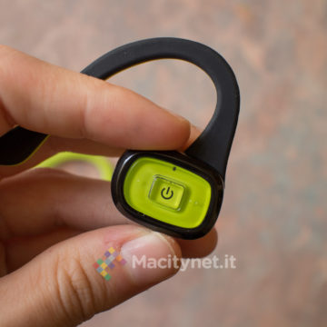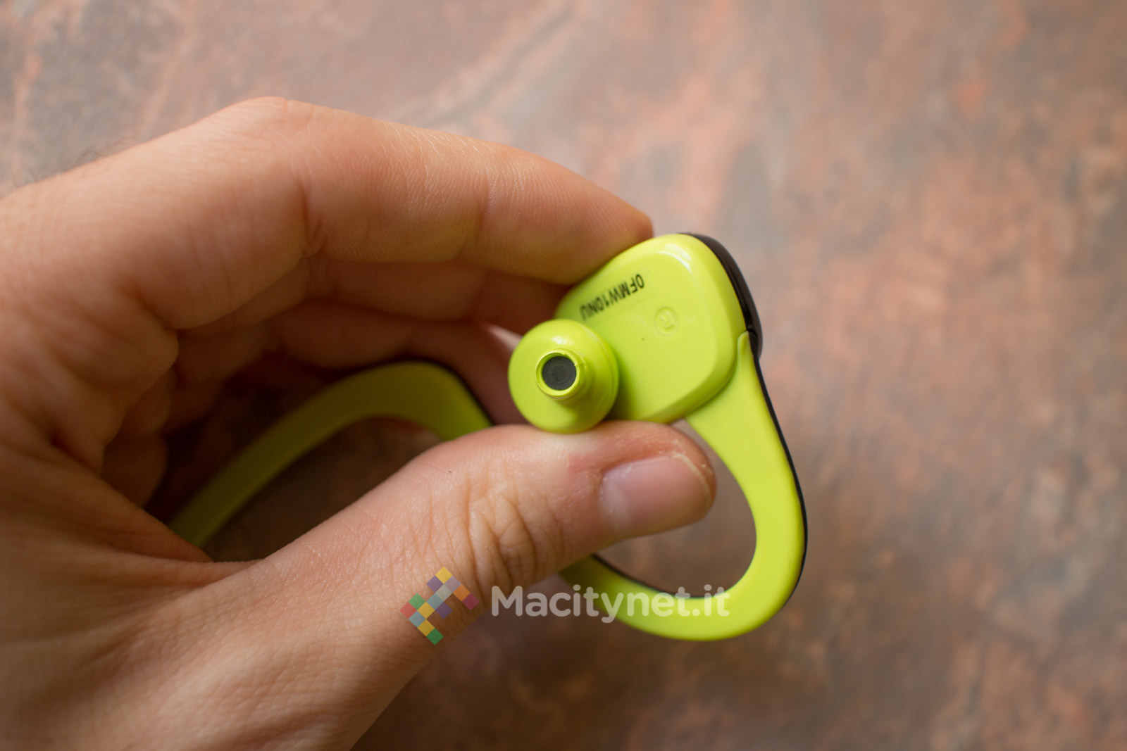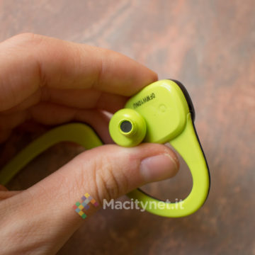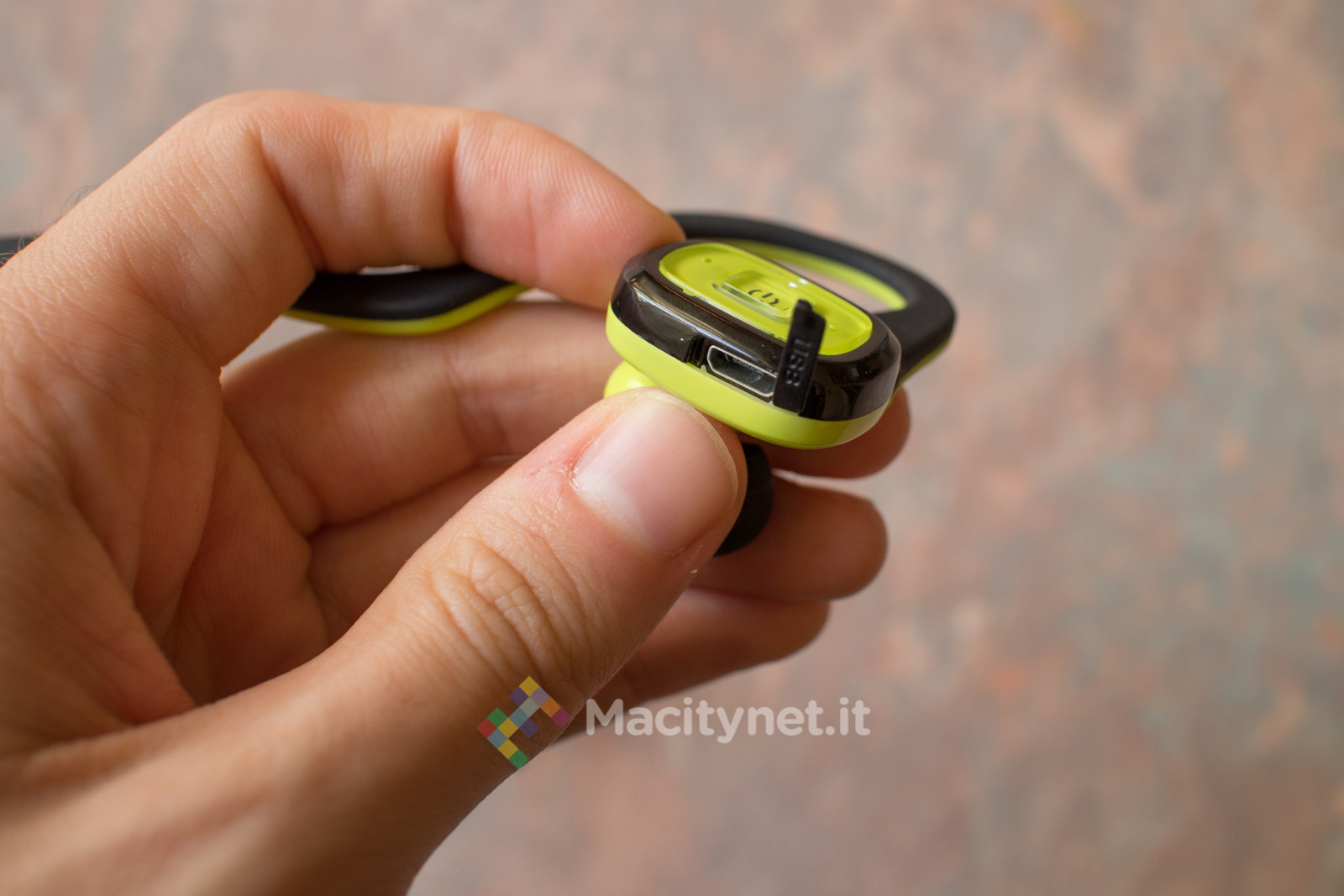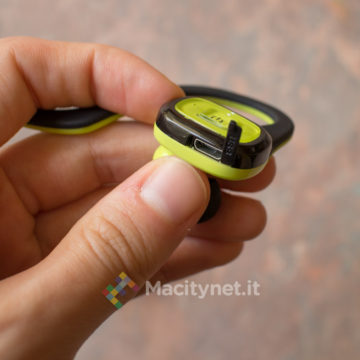 Gli auricolari veri e propri sono invece in plastica, piuttosto leggera ma sufficientemente robusta. Esternamente, sul destro troviamo, in basso, l’ingresso microUSB per la ricarica della batteria interna, ben coperto da un tappo anti-polvere e sudore, mentre esternamente c’è un piccolo pulsante Multifunzione ed un bilanciere per la regolazione del volume ed il salto delle tracce. In quest’area è localizzato anche un piccolo LED di notifica ed il foro per il microfono.