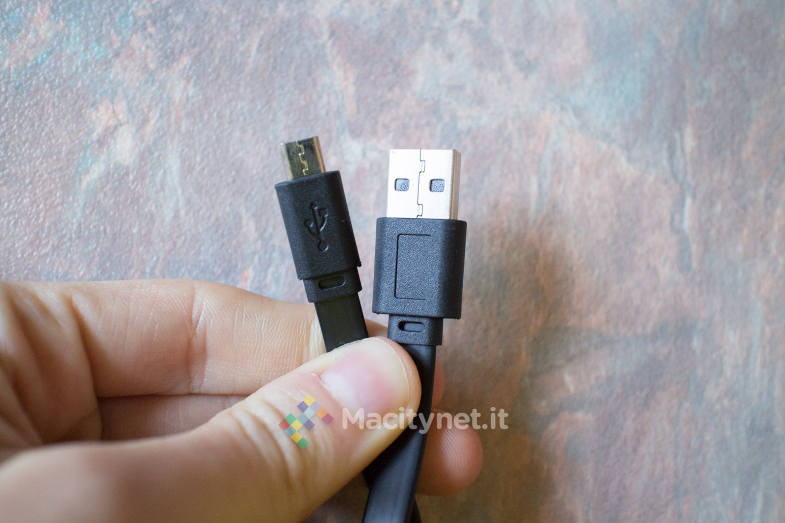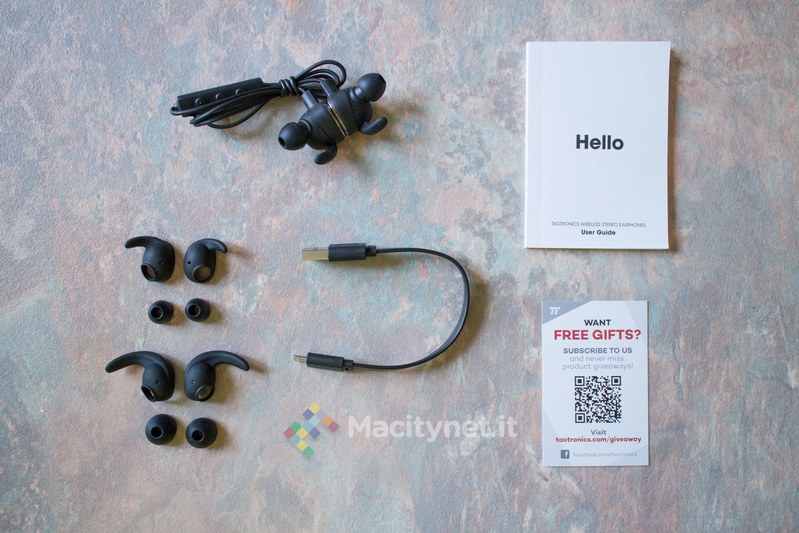 Nella confezione troviamo, oltre alle cuffie, una bustina contenente un cavo microUSB per la ricarica lungo una decina di centimetri ed una serie di alette e gommini di due ulteriori taglie a quelli già montati nelle cuffie, il manuale utente ed un tagliandino per la garanzia.