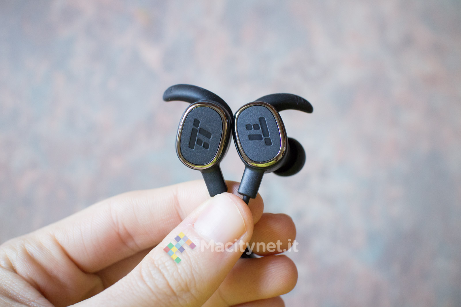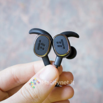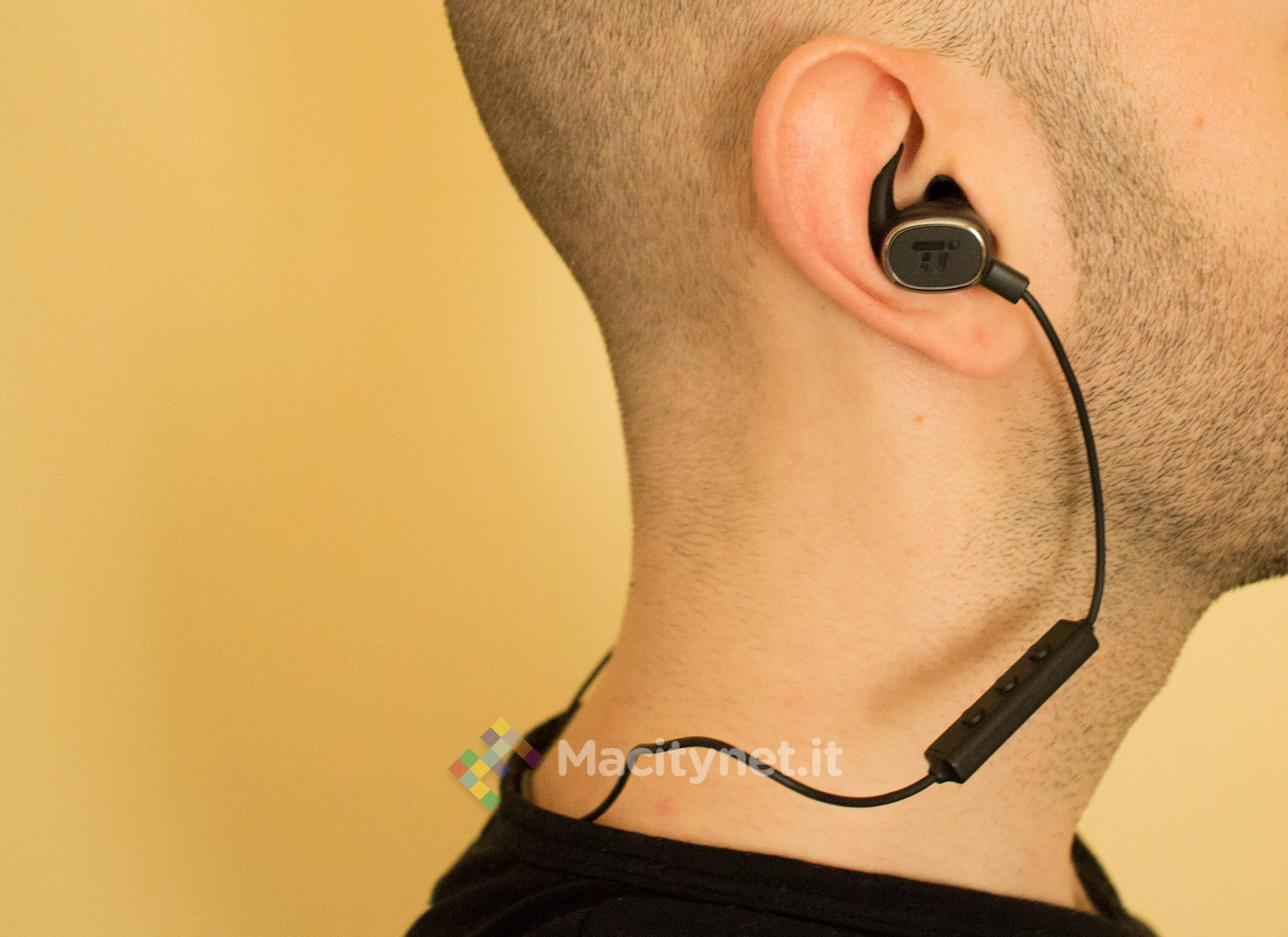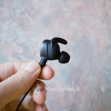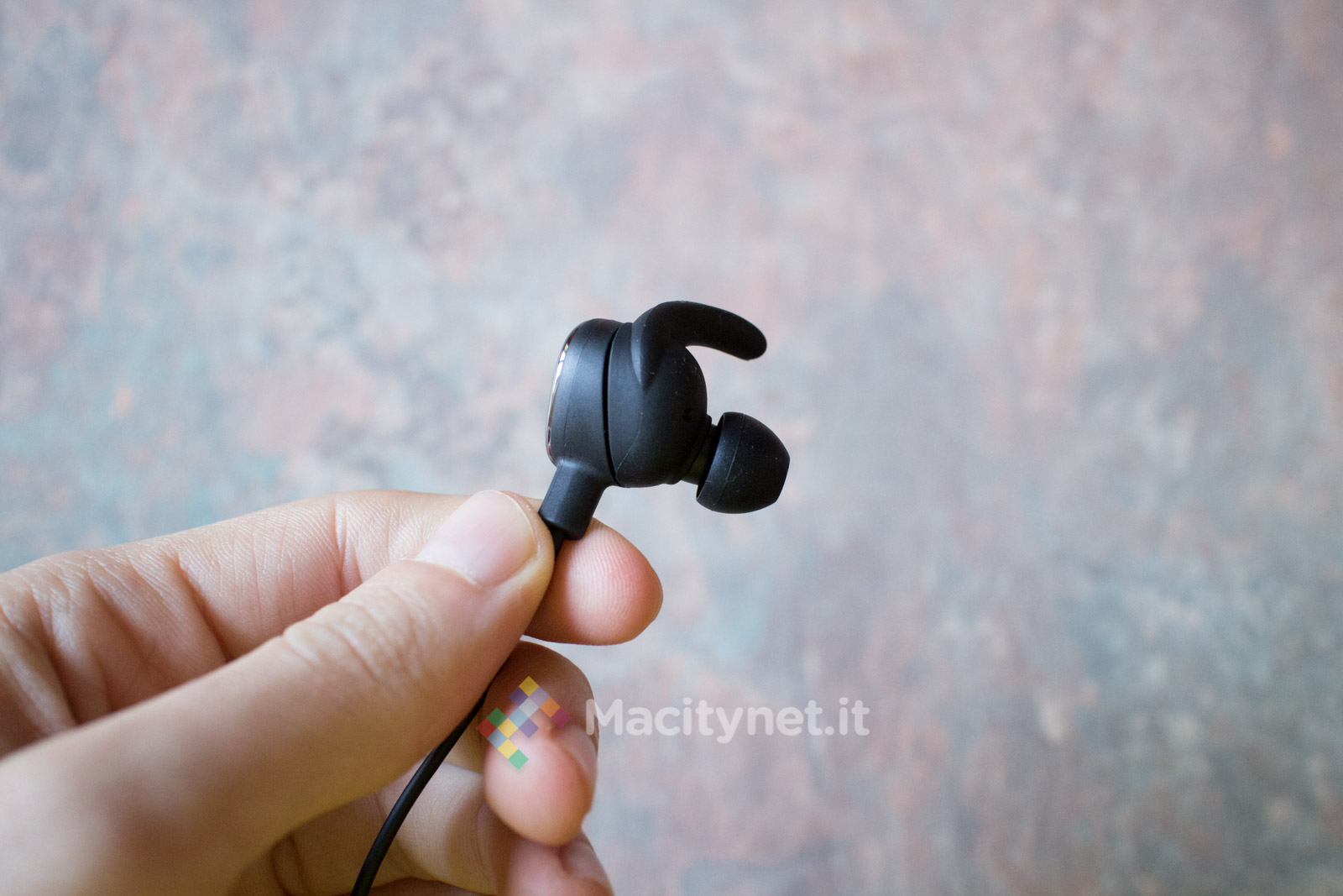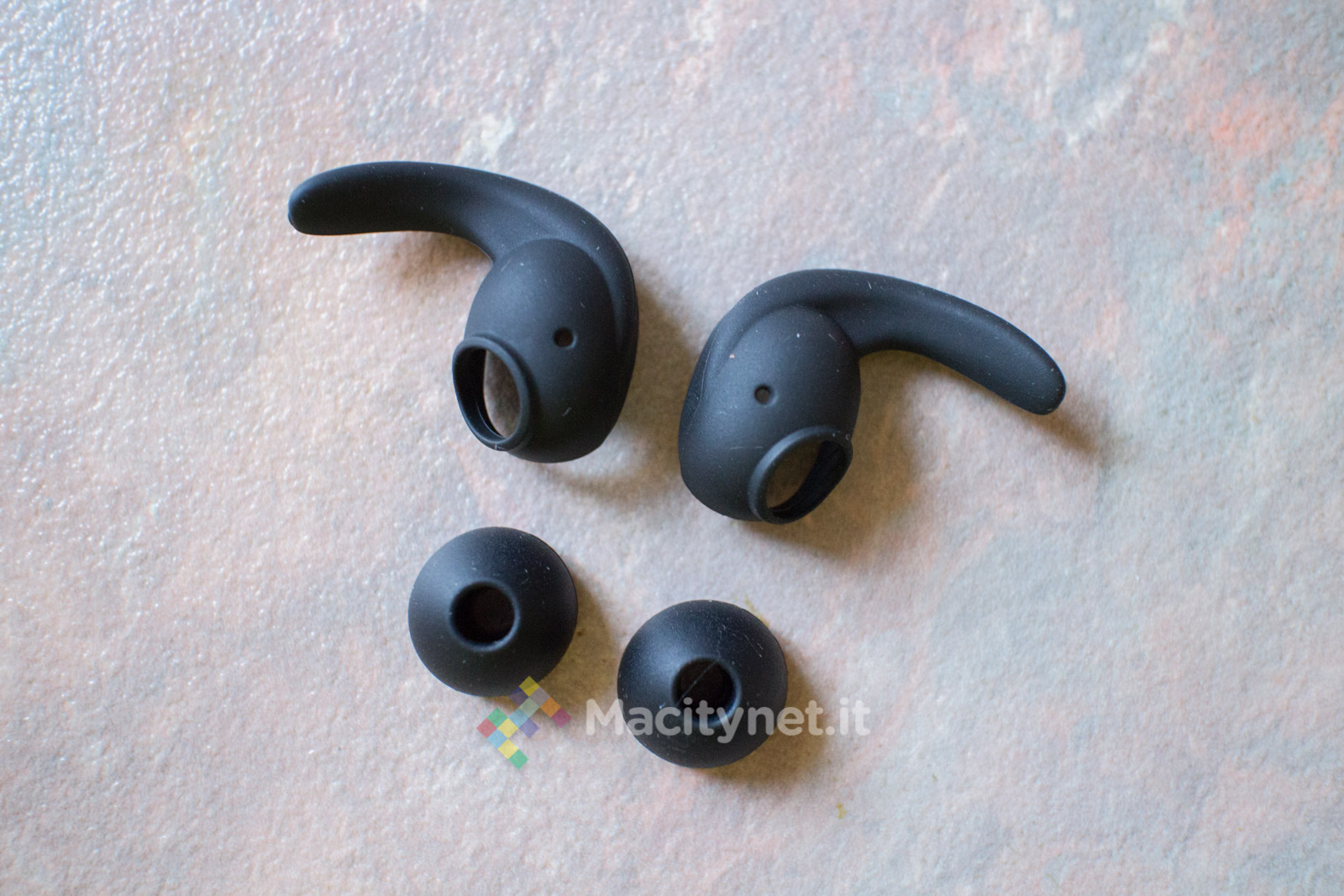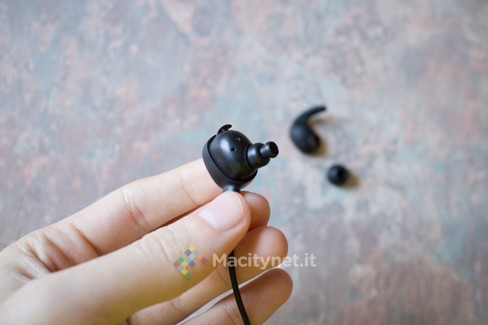 Gli auricolari offrono un sistema di alette (intercambiabili, di diverse misure) per aumentare la stabilità quando infilate nella cavità auricolare. Si tratta di una caratteristica che troviamo anche in altre cuffie per sportivi ma che in questo caso vengono potenziate nell’aderenza dalla superficie in gomma, molto più ampia e che avvolge praticamente tutta la facciata interna di ciascun auricolare.