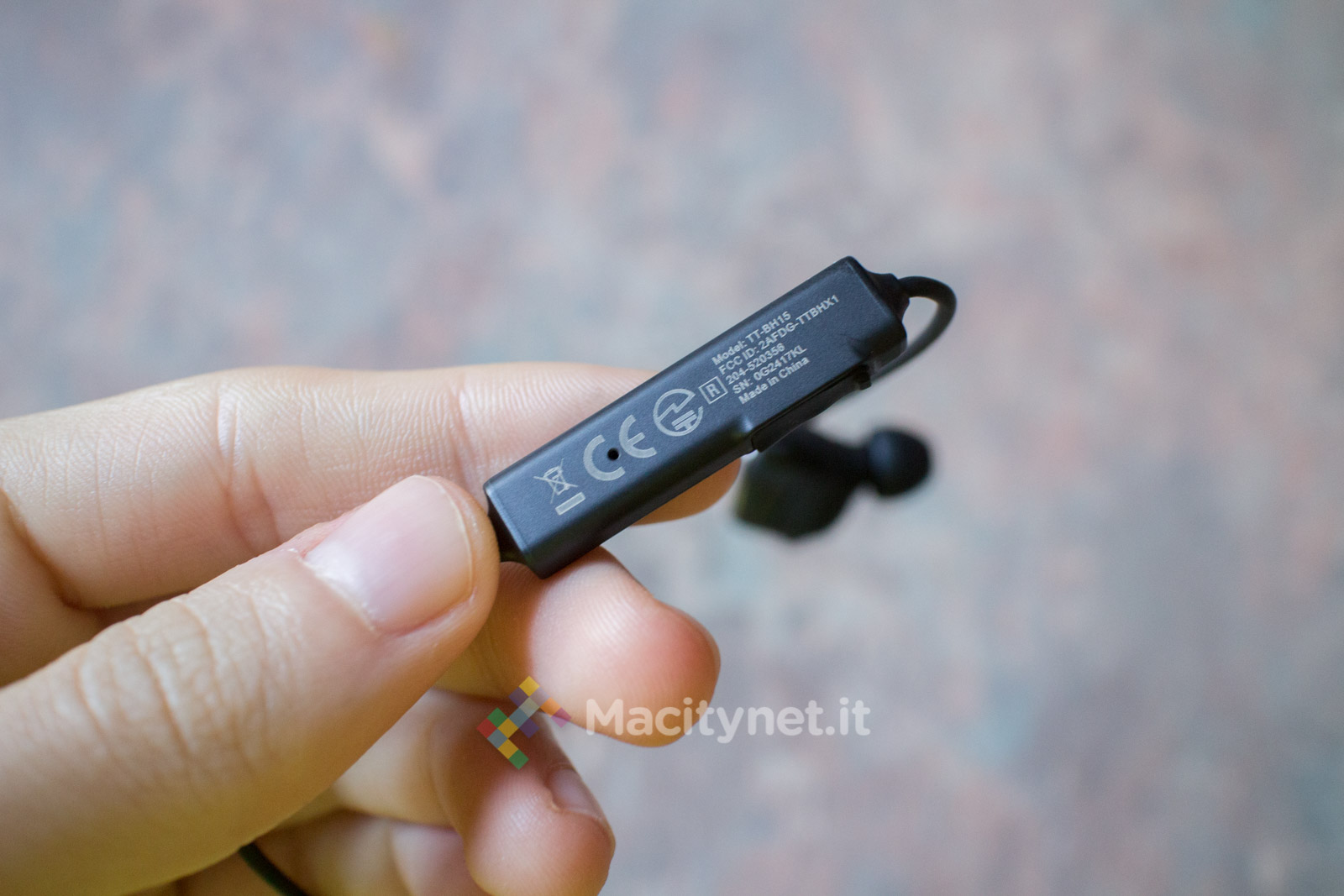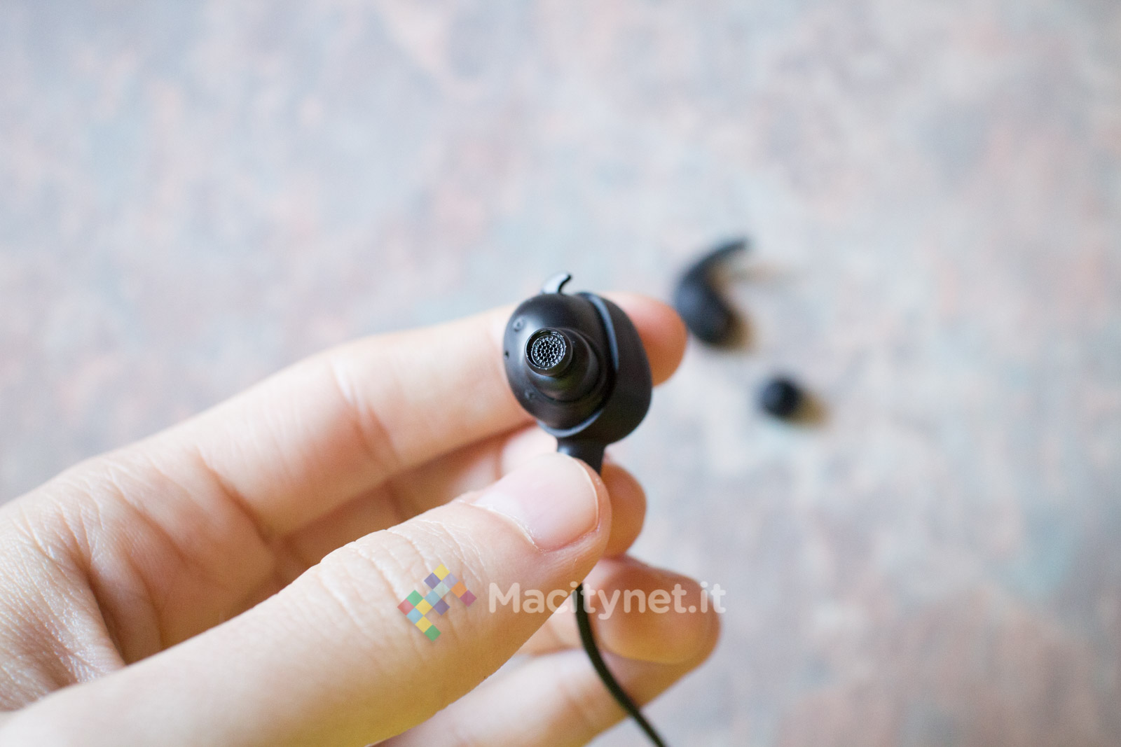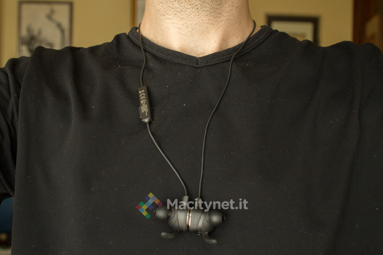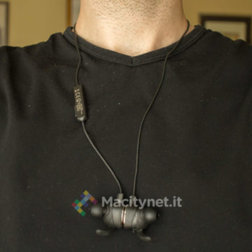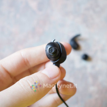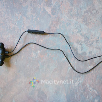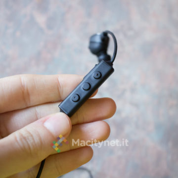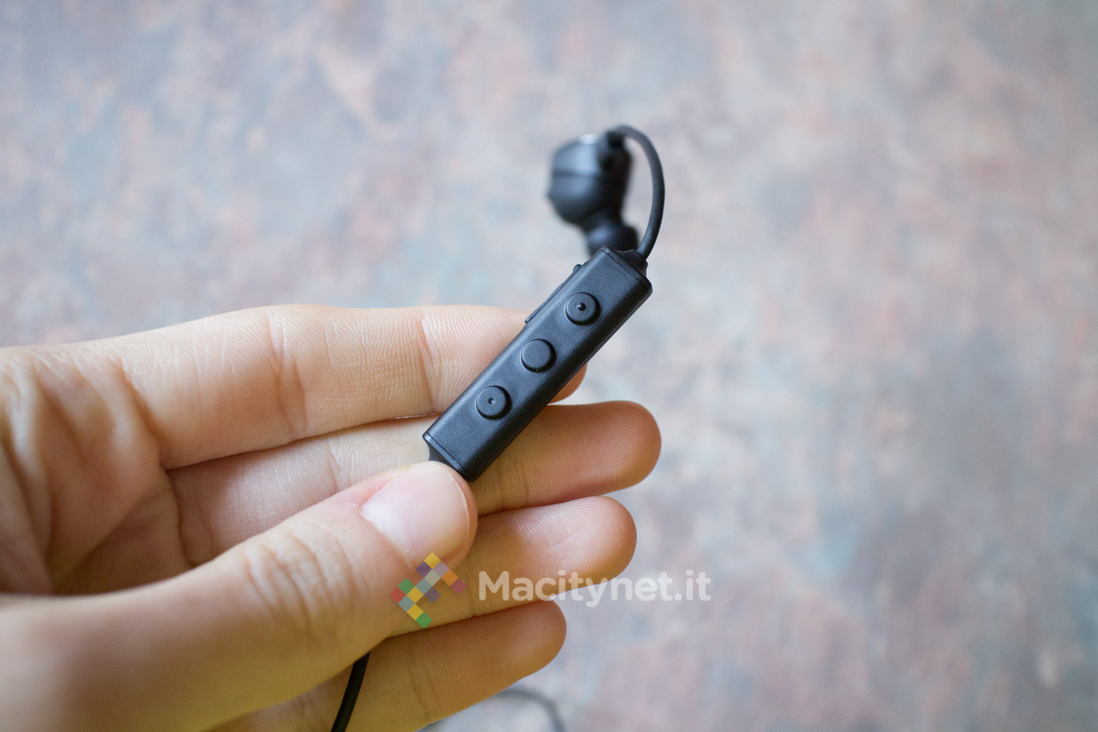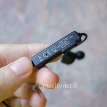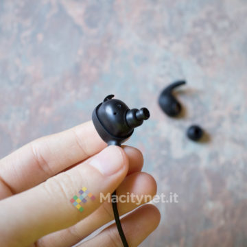 A pochi centimetri di distanza dall’auricolare destro troviamo, agganciato al cavo, il telecomando che permette di gestire la riproduzione musicale, il volume e le telefonate, oltre a poter richiamare l’assistente vocale con un doppio click del tasto centrale.