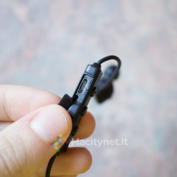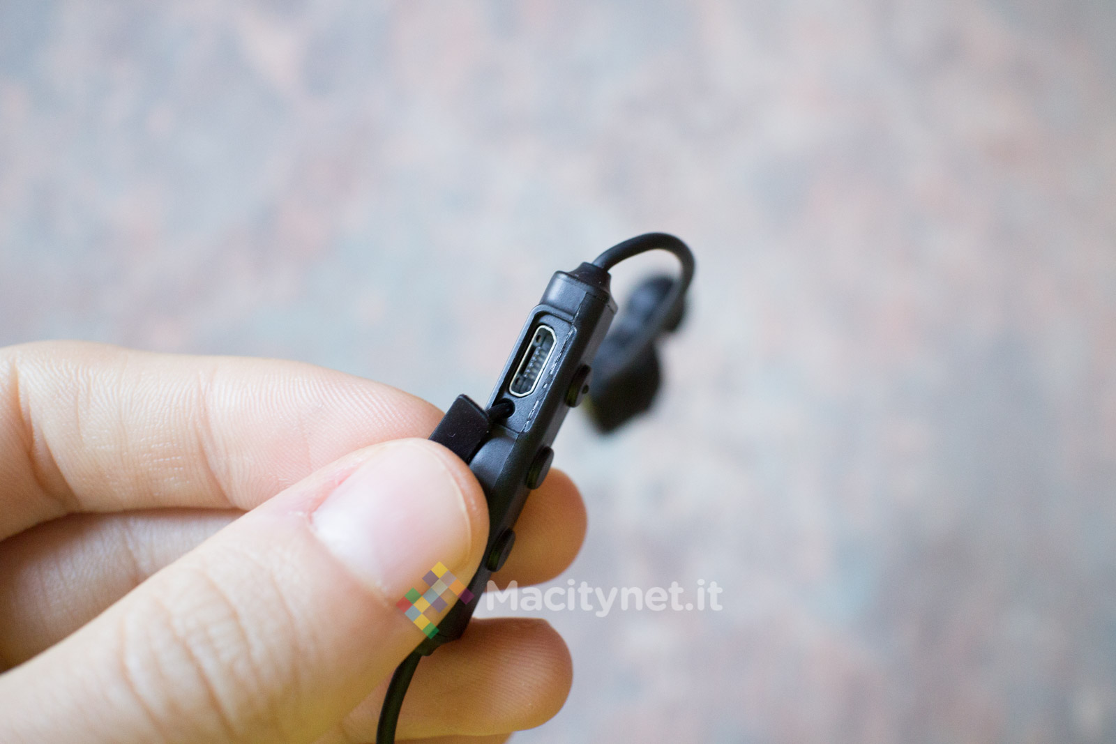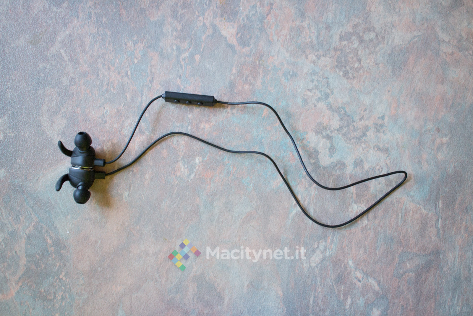 Il cavo, innanzitutto, è lungo appena 60 centimetri. E’ quindi mediamente più corto di quello che troviamo in altre cuffie di questo genere, con il vantaggio quindi di non averne troppo in eccesso che cade dietro al collo, con tutte le problematiche che ne conseguirebbero affiancandole a corse o allenamenti in palestra.