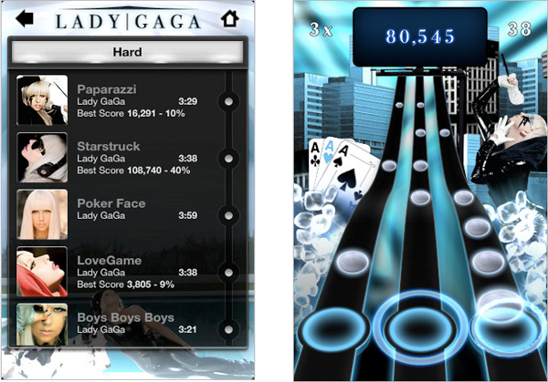 Tap Tap Revenge ricalca su iPhone e iPod touch il geniale stile di gioco che ha scatenato l’incredibile successo di RockBarnd e Guitar Hero sulle console da salotto. Gli appassionati di musica disco possono contare su una versione speciale di Tap Tap Revenge interamente dedicata al fenomeno del momento Lady Gaga, appunto Lady Gaga Revenge. Grazie a questo titolo i giocatori devono seguire le note premendo i corrispondenti tasti su schermo, senza perdere il ritmo, il tutto ovviamente sulla base di ben 14 brani che includono i più famosi titoli della pop star. Ricordiamo per esempio il tormentone Poker Face, LoveGame, Paparazzi, Just Dance, Boys Boys Boys e molti altri ancora.