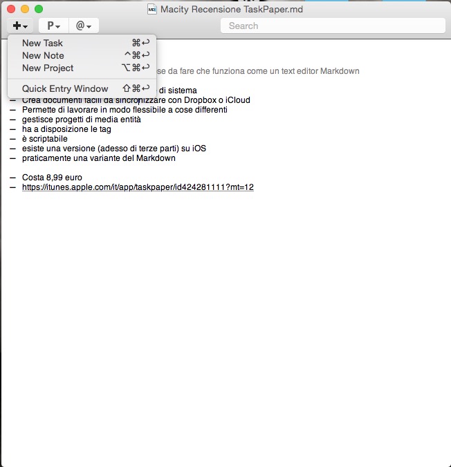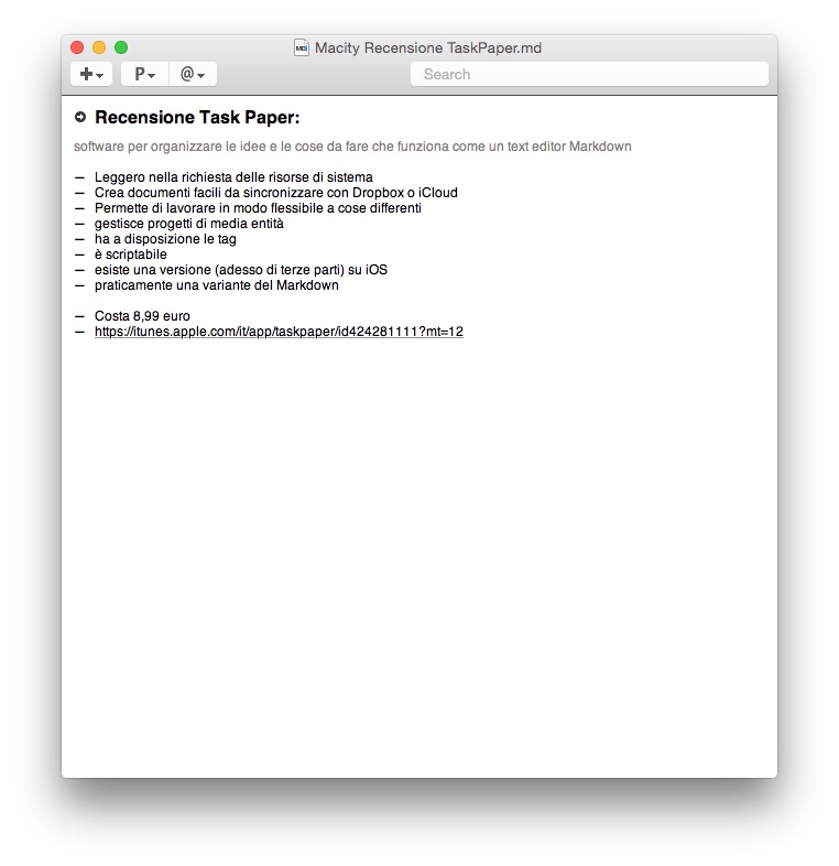 Ma soprattutto, è un sistema non proprietario. Il fatto che tutto il nostro lavoro (i dati che inseriamo all’interno dei documenti e dei progetti) siano sostanzialmente dei fogli di testo semplice, ci libera dall’ansia della sua possibile obsolescenza. Chi ha progettato TaskPaper, cioè il talentuoso Jesse Grosjean, a capo di Hog Bay Software, aveva a suo tempo fatto anche altre app per Mac (ricordiamo WriteRoom, per esempio, oppure l’ottimo FoldingText) e poi molti di questi equivalenti su iOS. In tempi più recenti ha deciso di lasciare quello spazio, che invece è stato per fortuna occupato da altri, valenti programmatori, come vedremo in una delle prossime puntate del nostro viaggio alla scoperta degli editor Markdown.