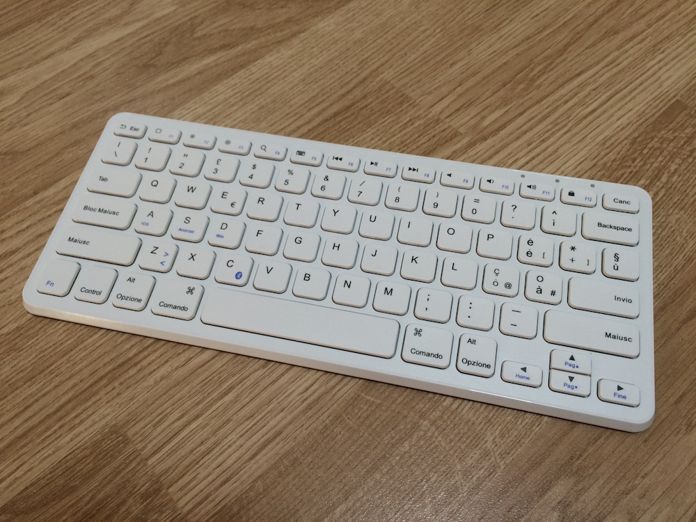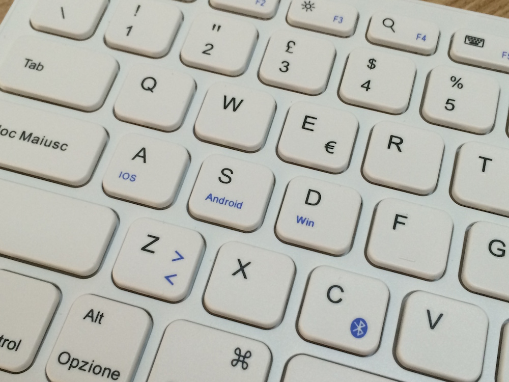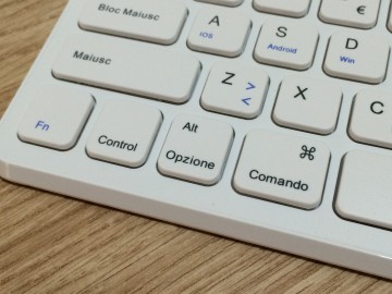 La superficie delle plastiche utilizzate non sono completamente lisce, ma al tatto risultano comunque piacevoli e, alla vista, sembrano di buona qualità. Insomma, si tratta di un prodotto solido, a dispetto di un prezzo davvero economico. Esteticamente risulta gradevole, completamente bianca (o disponibile anche nella colorazione nera), spezzata solo da alcuni caratteri blu, tra i quali spicca il tasto C con il logo del BT, oltre che le scritte “iOS”, “Android” e “Win” sui tasti “A”, “S” e “D”. Questi tasti, in accoppiata con il tasto FN, non permettono di switchare in un solo click tra un dispositivo e l’altro, ma di adattare il layout ai vari sistemi operativi, dato che alcuni tasti hanno funzioni esclusive riservate all’OS con cui si sta utilizzando la tastiera. In ogni caso, come già anticipato, la tastiera bluetooth Anker risulta pienamente compatibile con i vari sistemi operativi, permettendo di utilizzare i vari tasti funzione, come luminosità, volume e ricerca rapida, con qualsiasi dispositivo venga collegata.