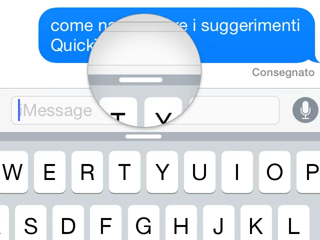 Il sistema per nascondere questa barra è davvero semplice ed immediato. Ed infatti, dopo aver cliccato su un qualsiasi campo di testo e aver richiamato la tastiera sarà sufficiente effettuare uno slide verso il basso, proprio come mostrato nell’immagine di seguito. Viceversa, per richiamare la barra con le predizioni sarà sufficiente effettuare un movimento contrario, invero uno slide verso l’alto.