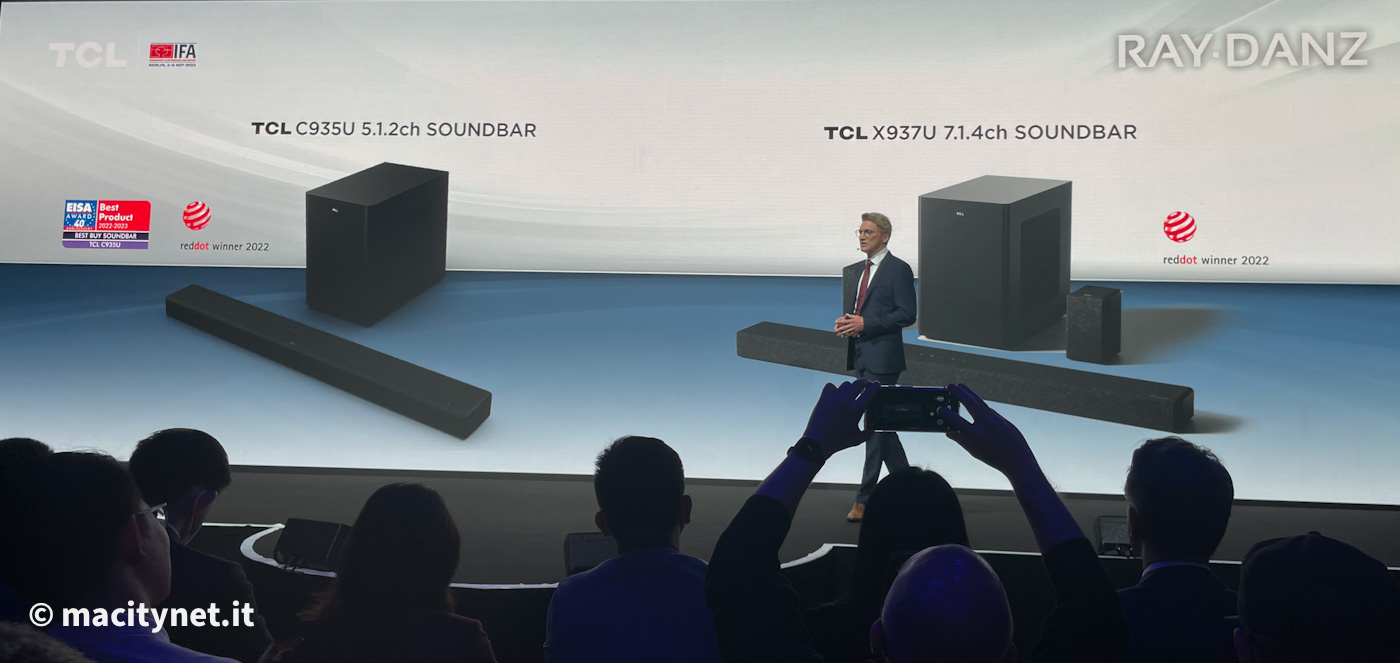 Per quanto riguarda l’audio, TCL ha presentato la nuova soundbar top di gamma X937U dotata dell’esclusiva tecnologia RAY-DANZ, oltre alla Soundbar C935, equipaggiata con RAY-DANZ e Dolby Atmos.