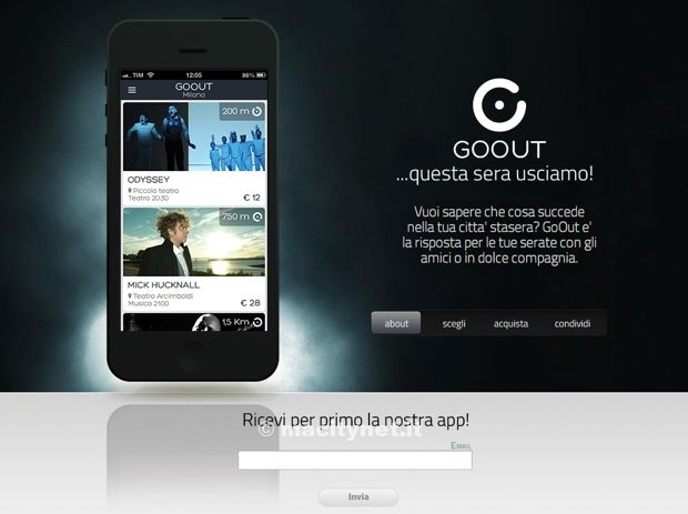 Rinnova la sua presenza a TechCrunch Appsbuilder che consente la creazione di applicazioni mobile attraverso editor semplificati. Goout è un’app dedicata al divertimento condiviso, filtra gli eventi che si svolgono nelle varie città italiane abbinandolo con un sistema di e-ticketing integrato.
