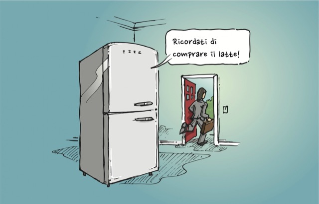 vignetta di un frigorifero che ricorda di acquistare il latte