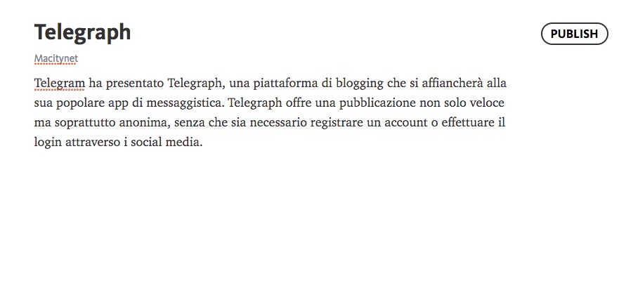 Fare un blog anonimo. È questo il traguardo cui punta Telegram con Telegraph, una piattaforma di blogging che si affiancherà alla sua popolare app di messaggistica. Telegraph offre una pubblicazione non solo veloce ma soprattutto totalmente priva di riferimenti specifici alla persona che scrive; non è infatti necessario registrare un account o effettuare il login attraverso i social media.