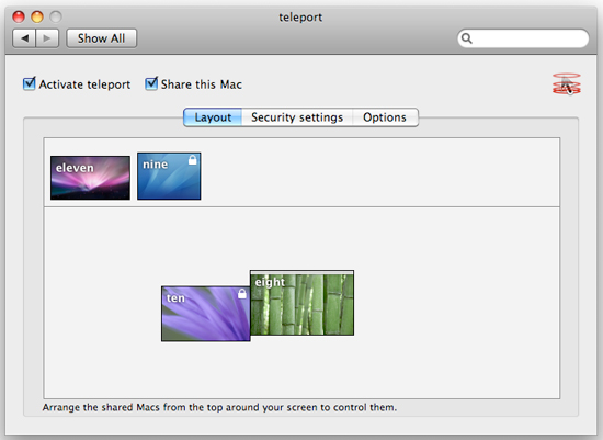 Per ritornare tra i confini del proprio monitor, basta riavvicinare il mouse al bordo dell’altro display e il teletrasporto ci ricondurrà  direttamente a casa. Se per esempio si usa un Mac fisso in rete come Fileserver e jukebox grazie a iTunes, in questo modo è possibile agire velocemente e senza bisogno di allontanarsi dalla propria postazione magari solo per copiare una frase da un documento e incollarla in un altro sul proprio computer.