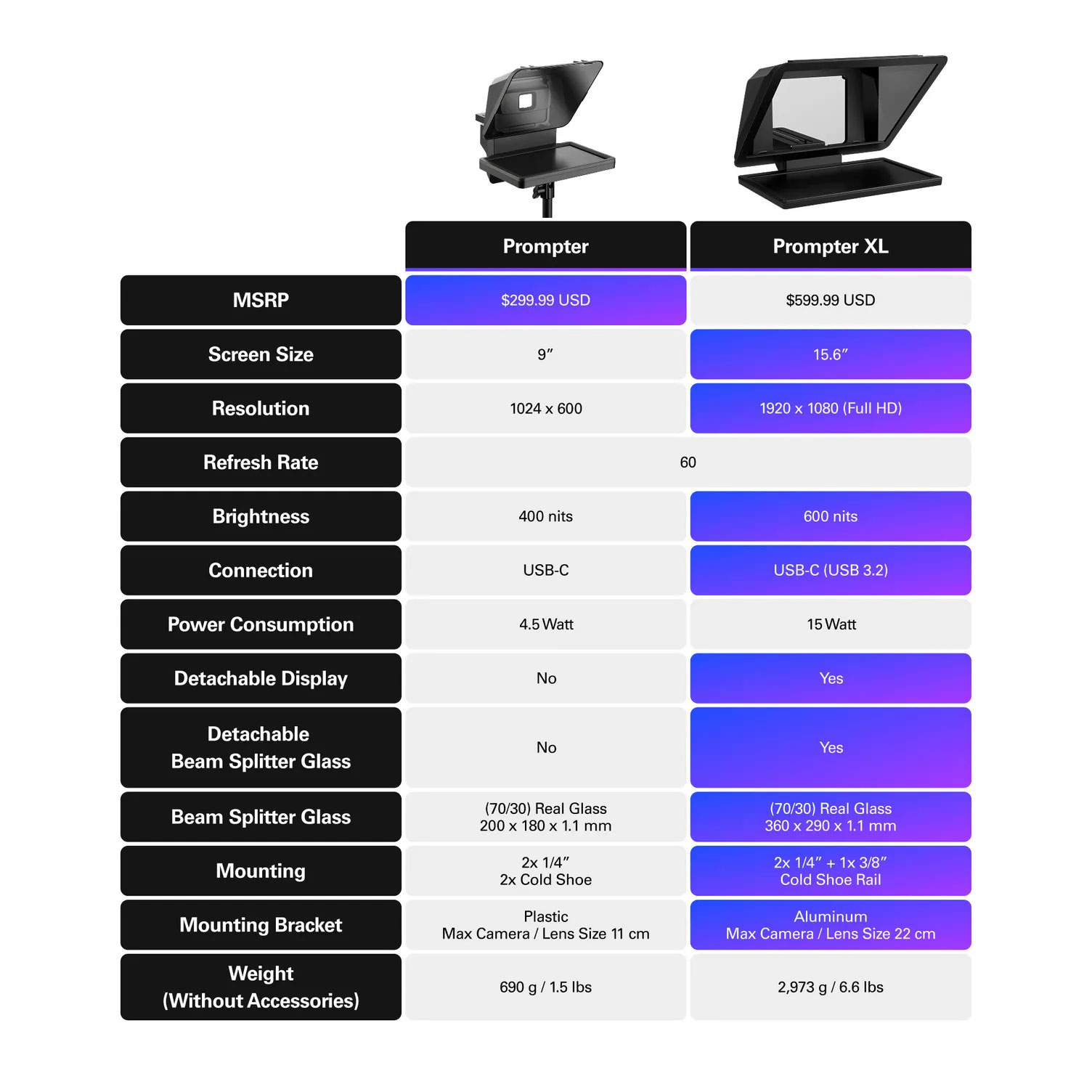 Our biggest teleprompter yet, featuring a 15.6" full HD removable display built for chat, scripts, meetings, and more.