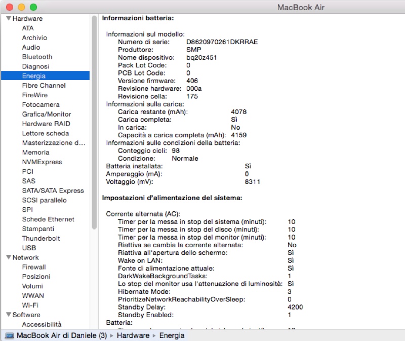 Per i computer Apple l’operazione è molto semplice: andate nel menu Mela, selezionate “Informazioni su questo Mac”, poi “Più informazioni”. Click su Resoconto di Sistema e poi su “Energia”. Qui leggerete tutte le informazioni sulla batteria, incluso il conteggio dei cicli. Vedrete anche la capacità originaria della batteria, espressa in mAh, e la capacità restante. Esistono anche applicazioni che forniscono istantaneamente la capacità della batteria e ne fotografano lo stato di salute. Una di queste è Coconut Battery, una storica app freeware molto facile da usare.