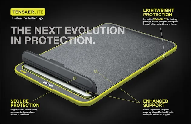 La custodia è di fatto composta di tre parti. una superiore, morbida, che ha una aletta magnetica, un bordo rigido e antiurto e una parte inferiore che è una sorta di vassoio che accoglie il dispositivo. Il tutto dovrebbe garantire protezione anche contro colpi accidentali senza aggiungere peso e spessore. La chiusura magnetica, come accennato, è però la vera novità: si eliminano i rischi di graffi oltre a rendere più pratica l’apertura e la chiusura.