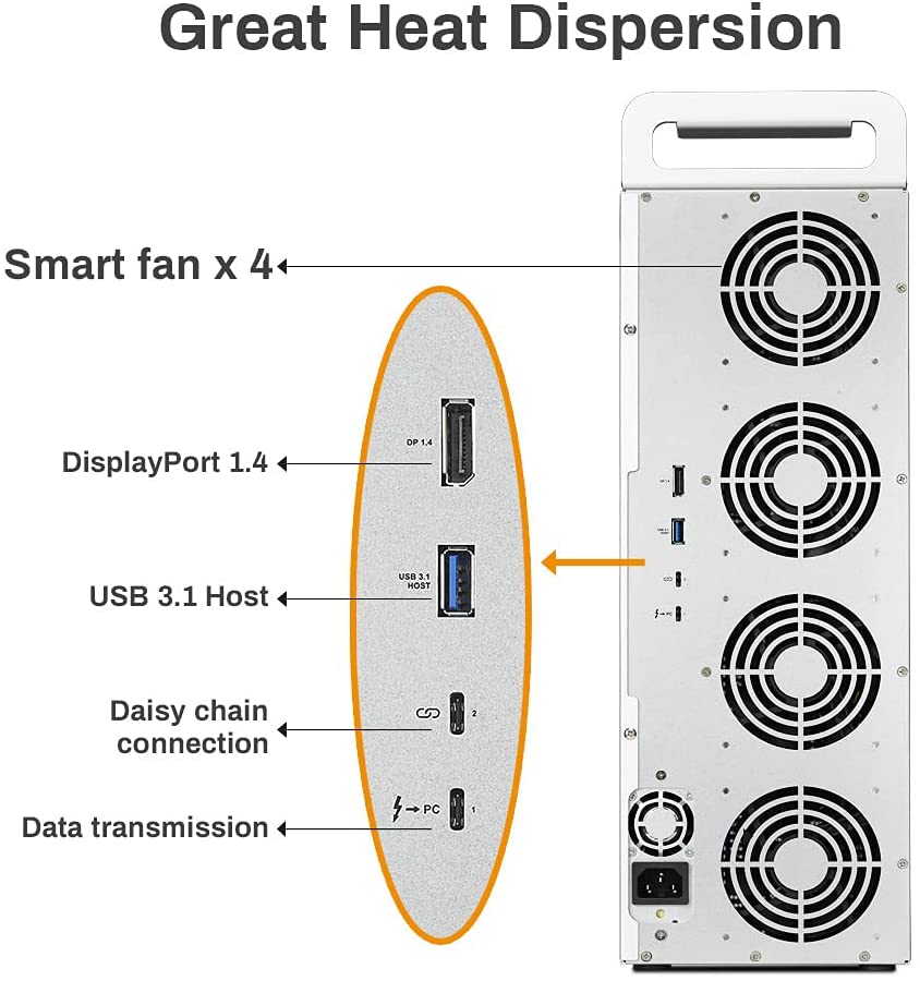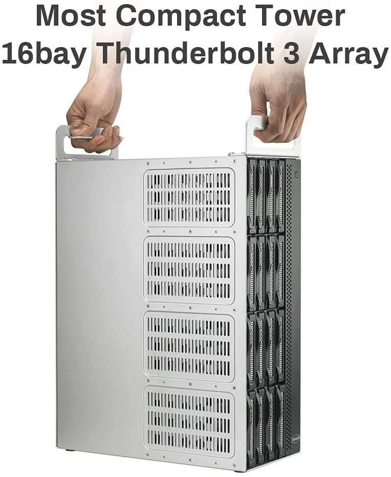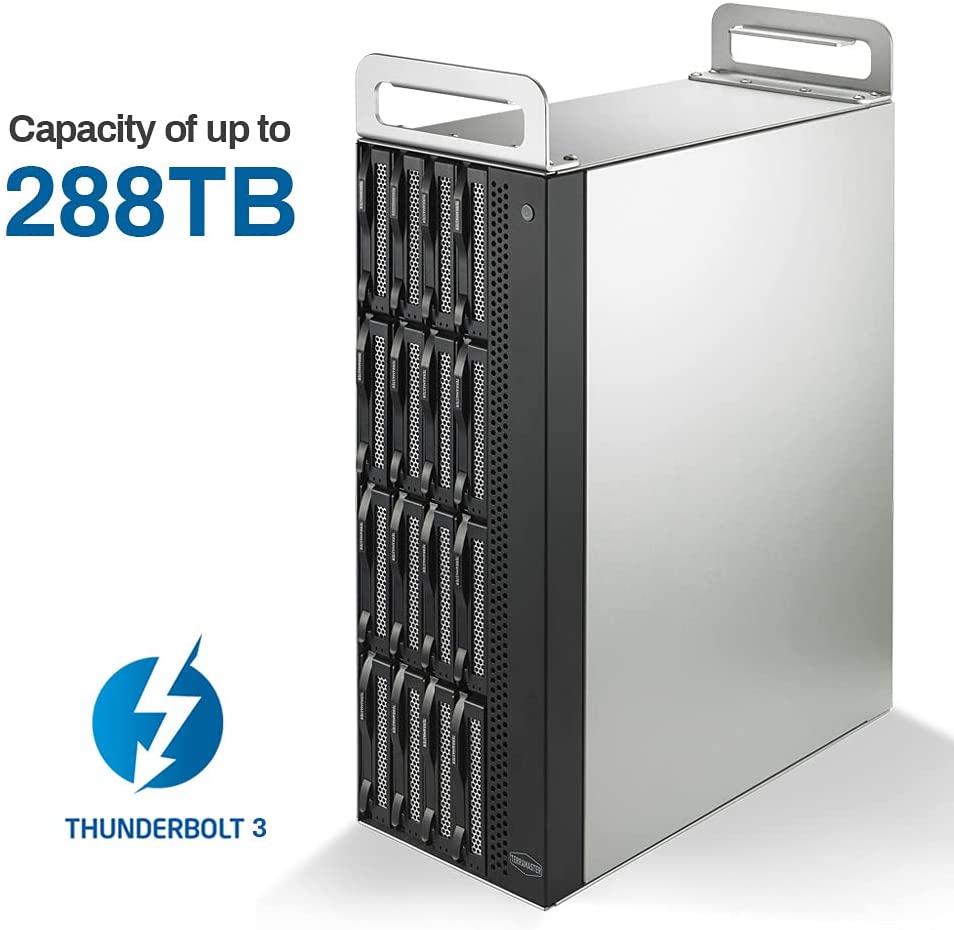 Lo spazio di archiviazione a 16 vani di D16 Thunderbolt 3 offre una capacità di archiviazione totale fino a 288 TB (16 dischi rigidi da 18 TB), supportando sia dischi SATA da 3,5″ che SSD da 2,5″. Altri dispositivi di archiviazione possono essere collegati in cascata tramite tecnologia Thunderbolt 3: utilizzando sei unità D16 Thunderbolt 3 collegate in cascata è possibile raggiungere un enorme spazio di archiviazione locale di 1 PB.