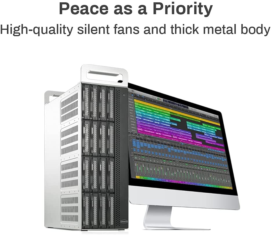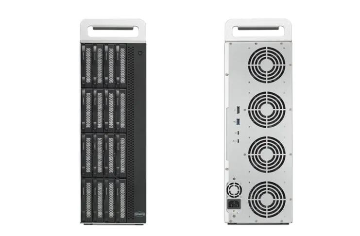 Il produttore riferisce che D16 è silenzioso e compatto al punto da poter essere posizionato su una scrivania, con un ingombro simile a quello di un tipico PC tower. Anche a pieno carico, la ventola silenziosa e la struttura interna ottimizzata aiutano ad aumentare il flusso d’aria interno del dispositivo per contenere la temperatura dei dischi, oltre a ridurre notevolmente la risonanza e il rumore.