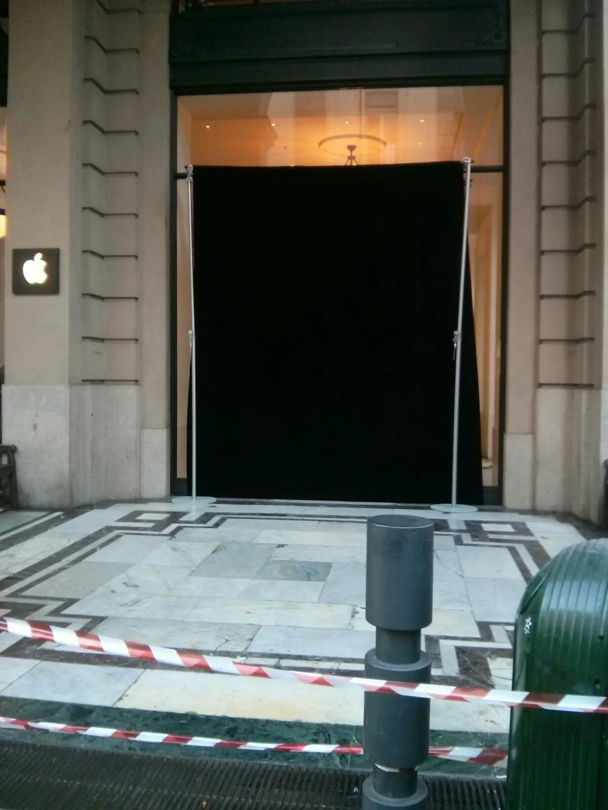 Ennesimo furto ai danni dell’Apple Store di Torino in via Roma: verso le 3 di notte i ladri hanno fatto irruzione distruggendo una delle vetrine. La dinamica è quella classica della spaccata con l’auto, una BMW bianca impiegata come ariete per creare un varco: una volta all’interno i ladri hanno fatto incetta di iPhone 7. In questo articolo riportiamo la foto della vetrina distrutta nella notte, ora coperta da una cerata nera, immagine inviataci da un lettore.