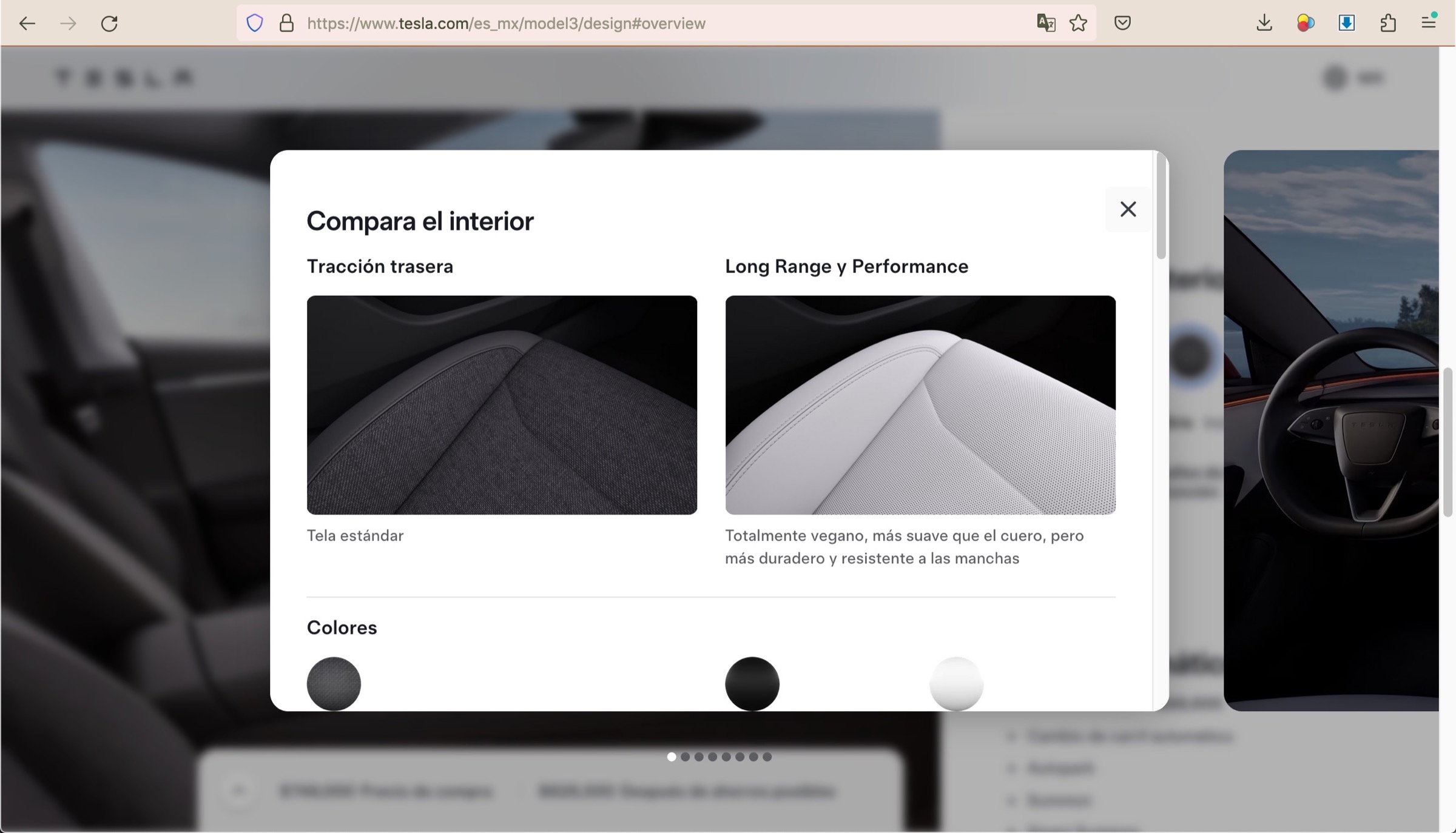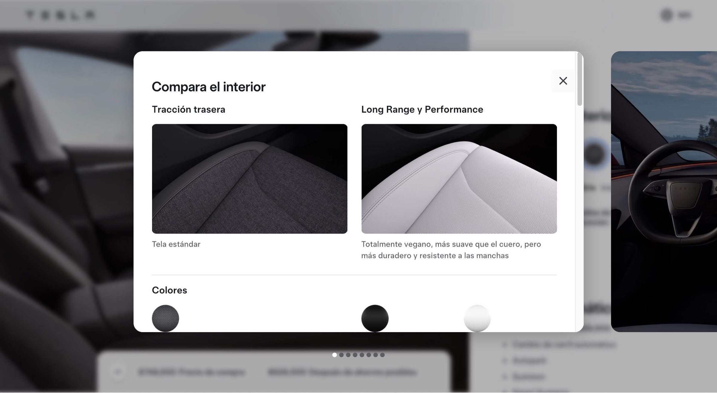 Come dicevamo nel configuratore Tesla del sito messicano, optando per la Model 3, si può selezionare la versione Model 3 Standard Range Rear-Wheel-Drive che, oltre a proporre gli interni in pelle vegana (soluzione più etica ed ecologica della pelle vera, che ne simula tutte le caratteristiche, ma è realizzata completamente con materiali vegetali o sintetici) nelle colorazioni bianco o nero, ne mette a disposizione una terza in tessuto di colore grigio.