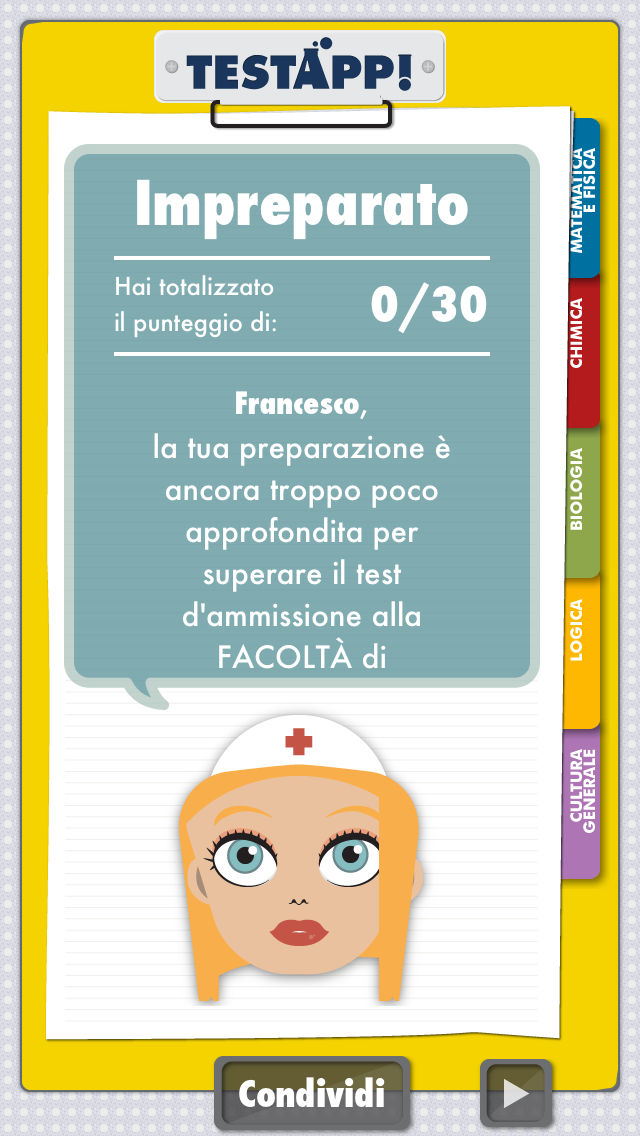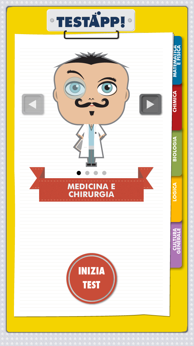 Con TestApp per iPhone e iPad possiamo mettere alla prova la nostra preparazione per i test di ammissione alle facoltà mediche a numero chiuso: Medicina, Odontoiatria, Veterinaria e Professioni Sanitarie. L’utente può affrontare una prova simulata di 20 domande in 20 minuti che include tutte le materie richieste dal Test Ministeriale di Settembre 2013: matematica, fisica, chimica, biologia, logica e cultura generale.