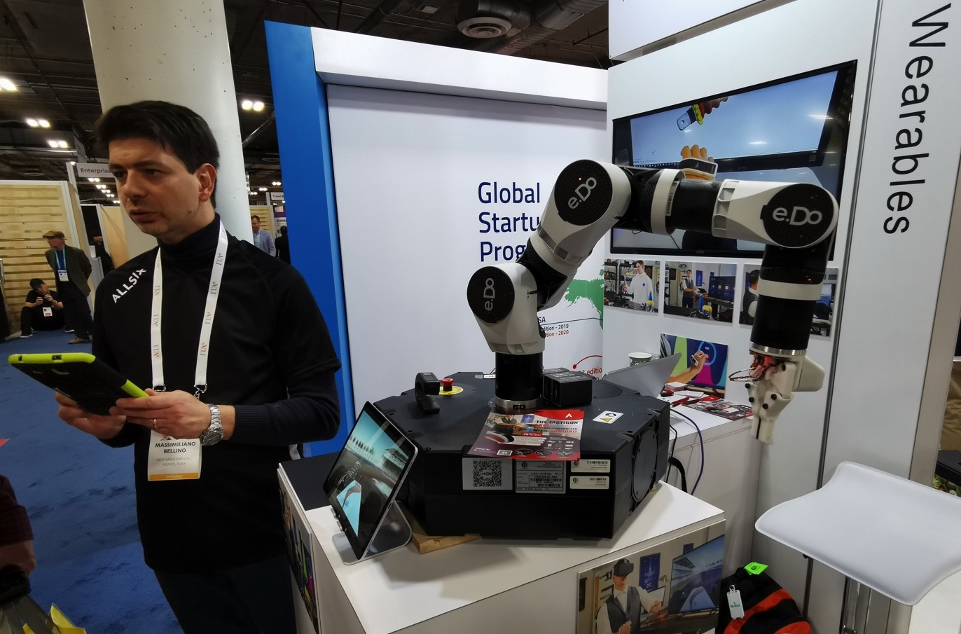 Questo progetto – ci ha spiegato Massimiliano Bellino in fiera con la dimostrazione del controllo di un braccio robotico – è nato lo scorso anno con la collaborazione di due università, la tedesca Kaiserslautern e il politecnico di Milano.