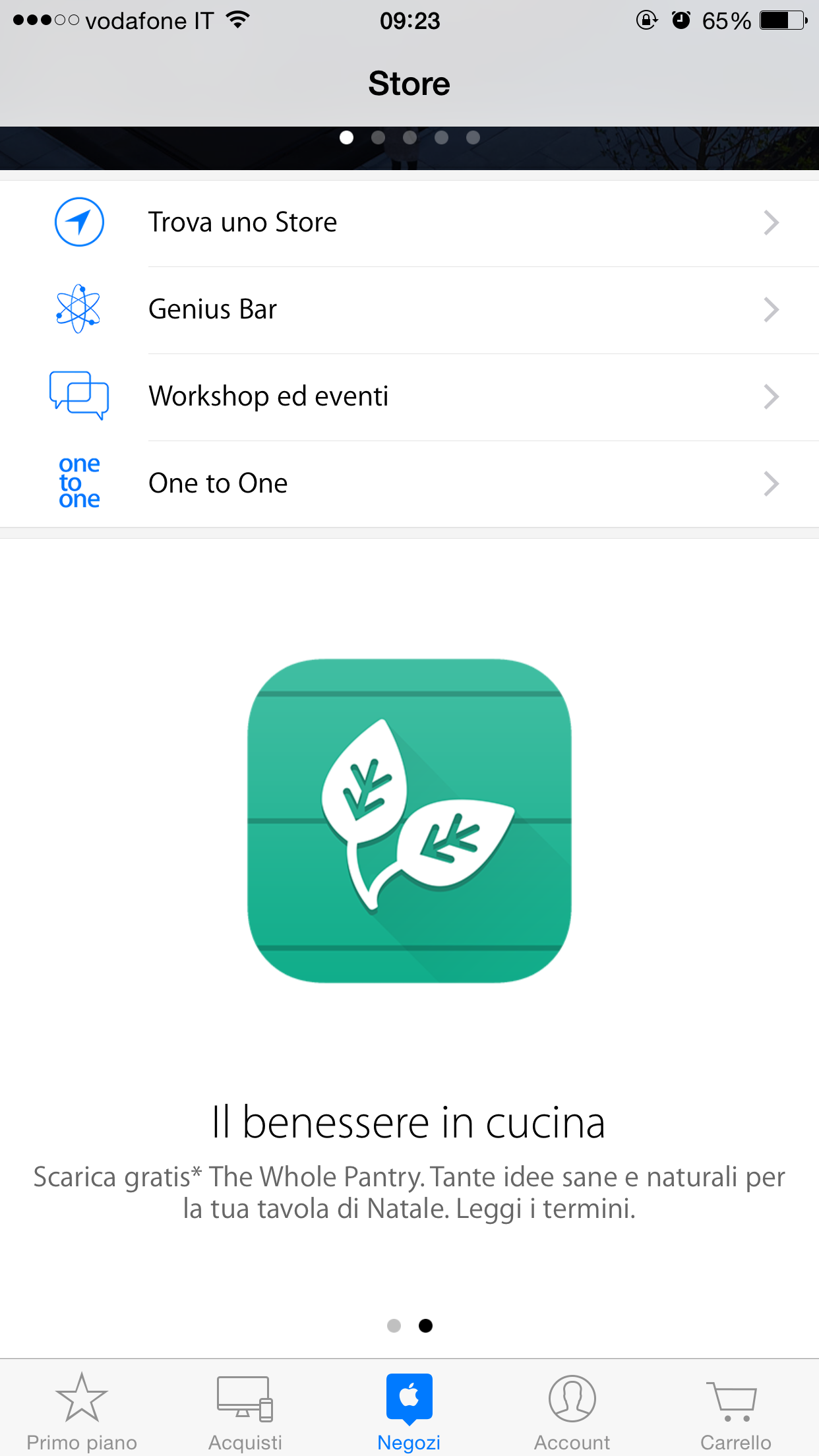 Lanciate l’app Apple Store, cliccate sulla scheda Negozi e scendete in fondo. Troverete due schede, una in primo piano e l’altra accessibile scorrendo verso destra: proprio quest’ultima, denominata “Il benessere in cucina”, permette di accedere alla promozione attualmente attiva. Cliccate la scheda e da qui seguite le istruzioni per scaricare gratuitamente l’app, che su App Store costa 2,69 euro.