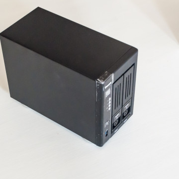 Fuori dalla scatola l’N2810 si presenta come un parallelepipedo di dimensioni sufficienti ad ospitare due dischi SATA da 3,5” (nel dettaglio 146 x 102 x 213 mm) di colore nero. Frontalmente il pulsante di accensione e spegnimento accompagna i due bay per l’alloggio dei due dischi, che si aprono frontalmente, oltre ad una porta USB 3.0 appena sotto. Altre due porte USB 3.0 sono presenti dietro, assieme a due porte Ethernet e una porta HDMI di cui dettaglieremo dopo. L’intero chassis è in metallo con forma e aspetto un po’ austeri, ma a noi non è dispiaciuto del tutto, considerata la praticità di alcune scelte: il pulsante d’estrazione funziona molto bene, e i due bay agganciano i dischi senza l’utilizzo di viti o altro, tutto ad incastro grazie a due bande laterali in plastica elastica. Il cambio di un disco, nel caso di rottura, è una operazione di un paio di minuti (più il tempo necessario al device per ripristinare il RAID). L’illuminazione è ridotta al minimo, così come l’interazione hardware: all’interno della confezione trova posto un cavo Ethernet e una serie di chiavi di sicurezza per il blocco dei bay di dischi, oltre ovviamente al cavo di alimentazione con alimentatore esterno.