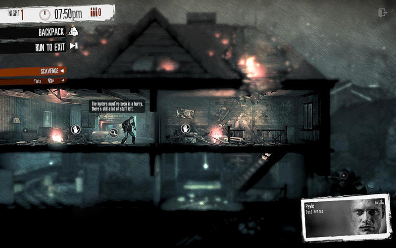 La storia che fa da sottofondo a This War of Mine è davvero cupa. Dopo la guerra il cibo scarseggia, l’acqua potabile è un miraggio, non c’è perfino elettricità. In questo clima è davvero difficile sopravvivere. Si tratta, allora, di un The Sims apocalittico, in cui guidare i personaggi durante un quotidiano che diventa quasi invivibile, insopportabile. In gioco l’utente guiderà un comune civile, che senza impugnare le armi, dovrà però combattere contro gli stenti. Il titolo propone un doppio scenario, che si alterna come ciclo giorno notte. Al mattino, i cecchini presenti sulle strade non permetteranno al giocatore di uscire dal proprio rifugio. In questa fase di gioco, pertanto, l’utente dovrà concentrarsi sul mantenimento proprio nascondiglio, dovendo anche badare alla cura e alla salute degli altri sopravvissuti. Di notte, invece, quando il presidio ostile nelle strade è minore, il giocatore dovrà mandare uno dei civili in missione per cercare di saccheggiare supermercati o altri luoghi in cui poter reperire cibo e viveri di prima necessità.