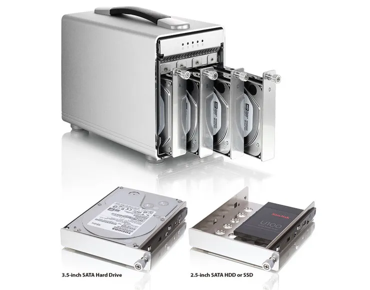Una seconda porta Thunderbolt 3 consente di collegare in cascata altri dispositivi, inclusi dispositivi USB 3.1 (10 Gbps) e DisplayPort. Sul dispositivo è presente uno slot di sicurezza Kensington. Le unità interne possono essere tradizionali dischi rigidi da 2,5″ o 3,5″ ma anche unità SSD. Il prezzo negli USA (del solo astuccio, senza dischi) è di 430 dollari. I prodotti di questo marchio in Italia si trovano su Amazon.