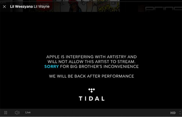 Il concerto è stato trasmesso in diretta via streaming da Tidal, ad eccezione del punto in cui è apparso sul palco Drake. L’artista avrebbe un accordo in esclusiva con Apple (è apparso sul palco dell’ultima WWDC per presentare Apple Music) e Tidal ha interrotto il broadcasting mostrando un cartello con la scritta: “Apple non permette lo streaming di questo artista. Siamo spiacenti per l’inconveniente del Grande Fratello. Torneremo dopo la performance”.
