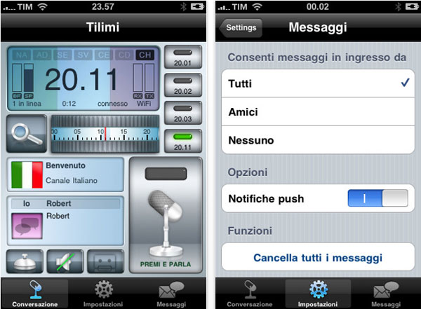 Lo sviluppatore permette così di provare le funzioni offerte dal programma e di familiarizzare con l’interfaccia utente, completamente ridisegnata. E’ sufficiente premere il pulsante Premi per Parlare per cominciare subito a comunicare con gli altri utenti. Successivamente è possibile espandere le funzioni di Tilimi tramite l’acquisto all’interno dell’applicativo. Tra le altre novità introdotte con la versione 2.2 ricordiamo la tastiera per l’inserimento del numero del canale, l’invio audio automatico, miglioramenti vari nell’interfaccia, nella stabilità dell’app e anche nel protocollo audio e molto altro ancora.