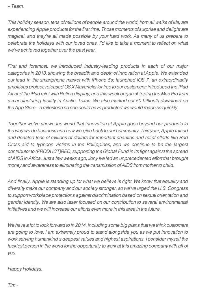 Cook conclude la lettera con i saluti e gli auguri di rito. “Sono molto orgoglioso di avervi a fianco, per avere messo l’innovazione al servizio dei valori più profondi del genere umano e di alte aspirazioni. Mi considero la persona più fortunata al mondo per l’opportunità di lavorare insieme con tutti voi in questa incredibile azienda”.