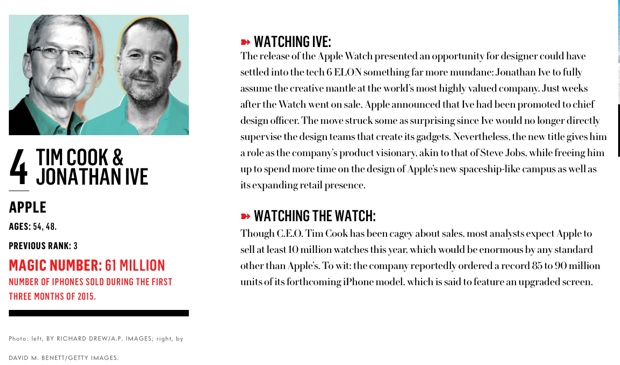 Come anticipato Tim Cook e Jony Ive sono entrambi al quarto posto, un piccolo arretramento rispetto al terzo posto del 2014: la celebre testata però non spiega le ragioni che hanno portato a questa decisione. Per quanto riguarda Ive viene notata la promozione al ruolo di chief designer officer avvenuta poco dopo il lancio di Apple Watch, una mossa che ha colto molti di sorpresa e che sembra lascerà più tempo per il guru del design non solo per seguire più da vicino il restyling degli Apple Store e il completamento del nuovo Campus “astronave”, ma che assegna a Ive un ruolo di visionario per l’intera gamma di prodotti della Mela, simile a quella svolta in precedenza da Steve Jobs.