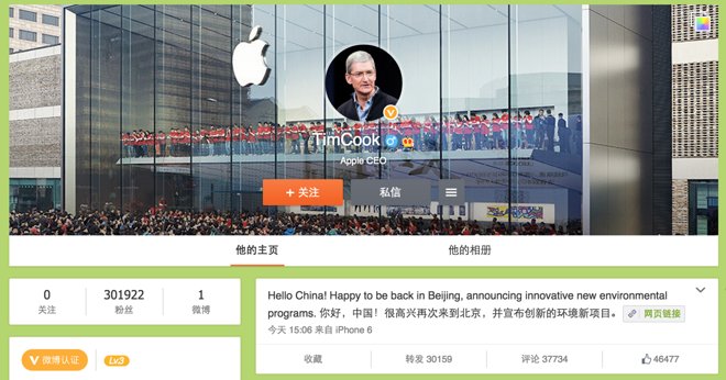 Cook apre un profilo su Weibo e raccoglie in una sola ora 300mila followers. È questo uno dei segni della popolarità che il marchio Apple e il suo capo hanno in Cina, dove Weibo è una sorta di contraltare a Twitter, bloccato delle autorità locali.