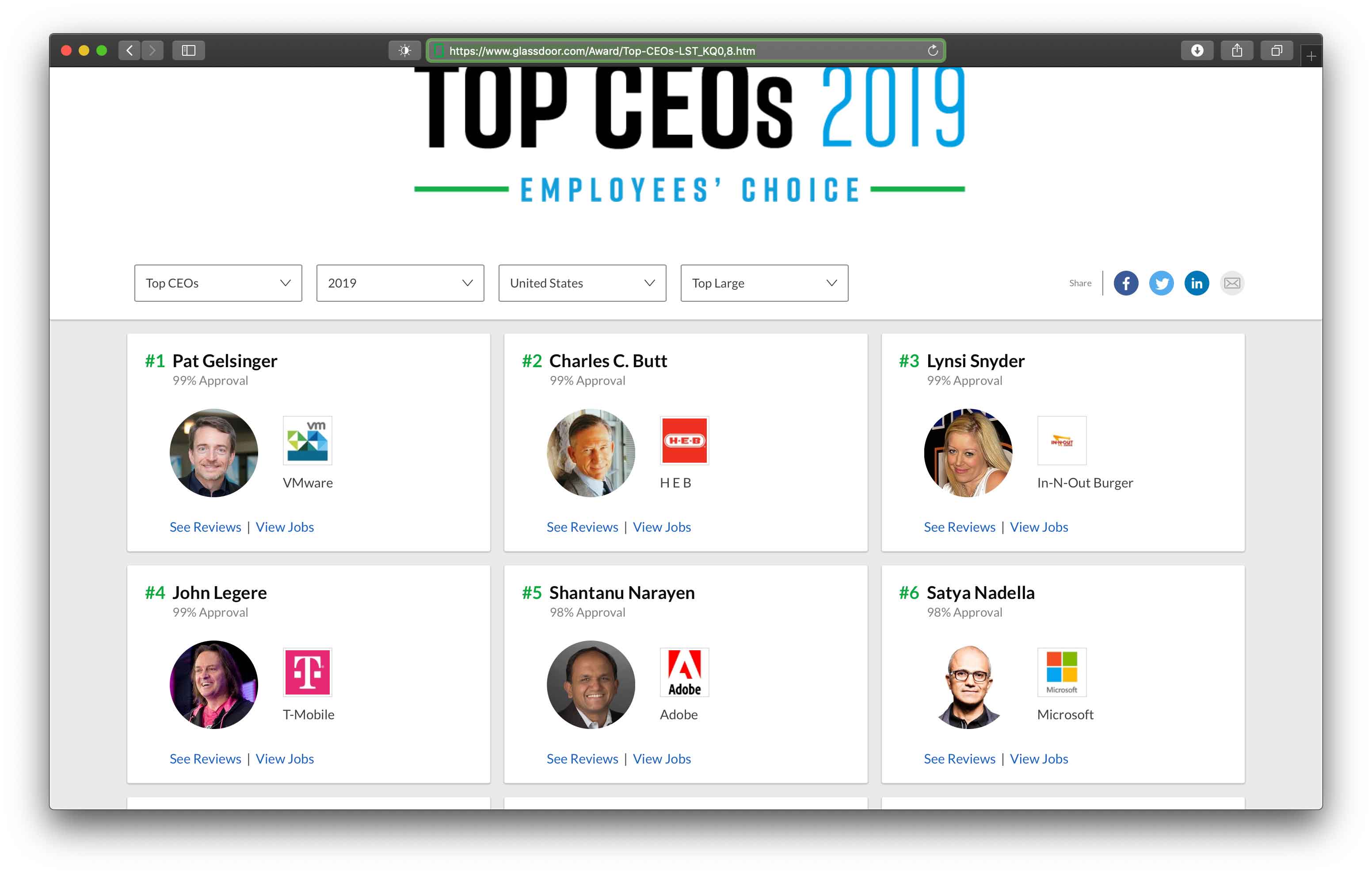 Shantanu Narayen di Adobe si piazza al quinto posto con un gradimento del 98%, seguito in sesta posizione da Satya Nadella di Microsoft, invece all’ottavo posto troviamo Jeff Weiner di LinkedIn. Jen-Hsun Huang di Nvidia è collocato al 18° posto. Mark Zuckerberg di Facebook è al 55° posto, in caduta rispetto al 16° posto dello scorso anno.