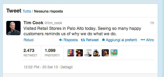 Dall’account Twitter di Cook apprendiamo che segue la squadra di basket di Duke (noti anche come Blue Devils) una delle università di maggior tradizione nella pallacanestro, e l’Auburn Plainsman (giornale creato da studenti dell’Auburn University dell’Alabama). In uno degli ultimi tweet, Cook dice di aver visitato il Retail Store di Palo Alto e aver visto molti clienti felici che gli ricordano “perché facciamo quello che facciamo”. D’altra parte Cook ha di che essere contento: le file nei negozi dove sono stati lanciati i nuovi iPhone sono rivelatrici dell’ennesimo successo. Nel momento in cui scriviamo Cook ha già oltre 44.000 follower.
