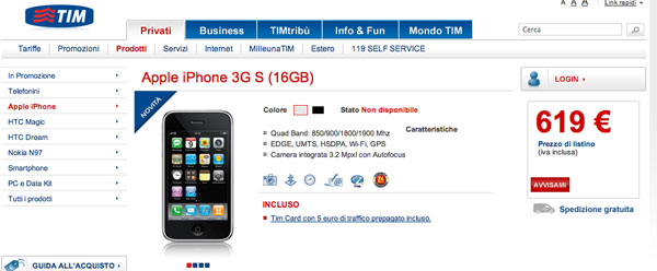 Da alcuni minuti nel sito Internet di TIM [sponsor] sono apparsi i moduli di acquisto per la nuova linea di iPhone che include i due modelli di iPhone 3GS e il precedente iPhone 3G da 8GB.