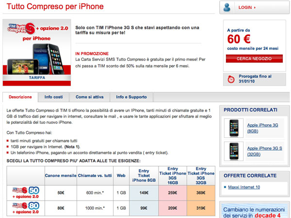 L’operatore TIM rivede e semplifica notevolmente i piani tariffari dedicati ad iPhone: ora gli utenti che desiderano lo smartphone della Mela con TIM possono scegliere tra due piani Tutto Compreso che partono da 50 euro al mese. Con il piano “Tutto Compreso + opzione 2.0” da 50 euro mensili si ottengono 600 minuti di chiamate verso tutti, 1GB di traffico Web e prezzi di 149 euro per iPhone 3G da 8GB, 259 euro per iPhone 3GS da 16GB o 369 euro per il 32GB. Con il piano “Tutto Compreso+opzione 2.0” da 80 euro al mese si hanno 1.000 minuti di chiamate, 1GB di traffico Internet, mentre i prezzi per iPhone sono di 99 euro per il 3G, 209 euro per il 3GS da 16GB e 319 euro per il 32GB.