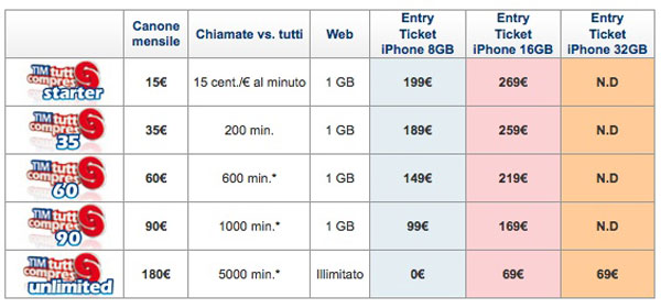 Ora resta da vedere la risposta di Vodafone che potrebbe anch’essa rivedere il proprio listino abbonamenti per iPhone: i piani lanciati con l’introduzione di iPhone 3GS infatti scadono il 14 novembre. Qui riportiamo la tabella dei nuovi piani TIM mentre più in basso la precedente tabella con i piani eliminati.