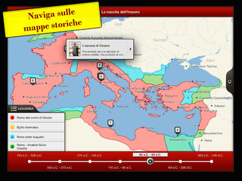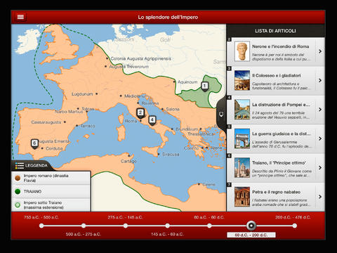 Timemaps: Storia di Roma è un’app per iPad che offre allo studente della scuola secondaria di primo grado un modo decisamente diverso da quello tradizionale offerto dai libri di testo di esplorazione delle vicende del più grande impero dell’antichità, dalle sue origini alla caduta.