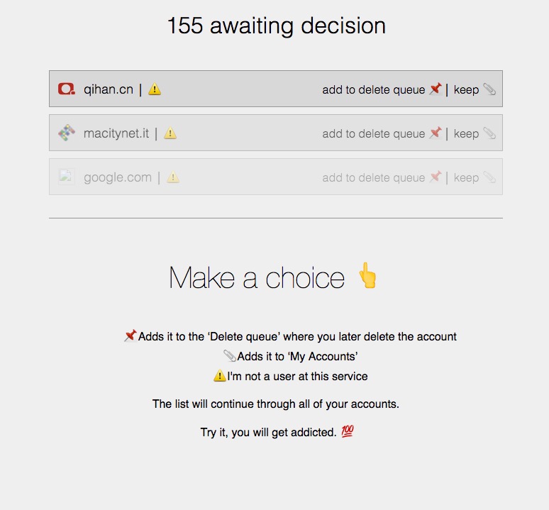Basta visitare il sito deseat.me, fare log in con il proprio account Google e attendere che il sito provveda a scandagliare la rete alla ricerca di tutti gli account che hanno memorizzato il vostro indirizzo email. deseat.me mostrerà l’elenco dei servizi e a quel punto l’utente potrà decidere per ognuno se mantenerlo o se aggiungerlo alla coda di cancellazione.