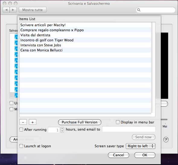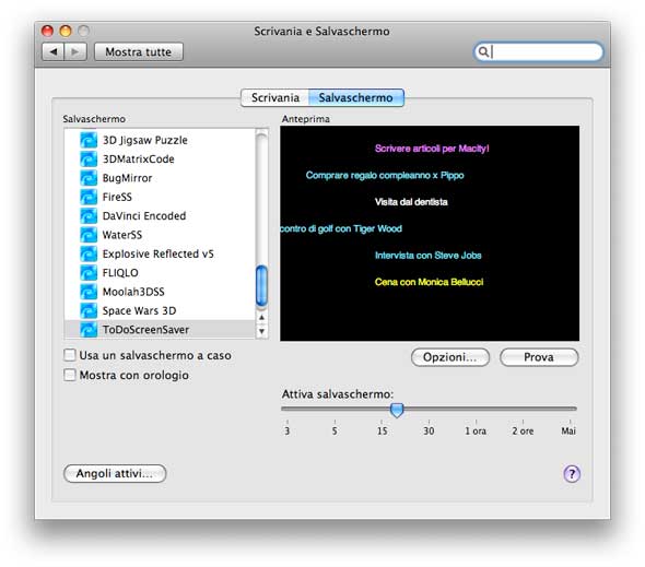 La piccola software house Phelios ha rilasciato ToDoScreenSaver, un semplicissimo salvaschermo per Mac OS X da usare per ricordare appuntamenti ed eventi. Dopo aver scaricato il file d’installazione (sono solo 608KB), basterà fare doppio click per installarlo. Al termine della veloce installazione, il nuovo screensaver sarà presentato nella sezione “Scrivania e Salvaschermo” delle Preferenze di Sistema. Selezionando “Salvaschermo” e “ToDoScreenSaver” nell’elenco, comparirà il pulsante “Opzioni…” e da qui aggiungere gli elementi da far comparire sullo schermo.