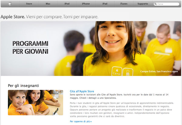Torna l’iniziativa Gita all’Apple Store organizzata da Apple e destinata agli studenti delle scuole primarie e secondarie. Previa prenotazione gli insegnati possono accompagnare grippi fino a 25 ragazzi presso l’Apple Store per creare e presentare progetti grazie alla piattaforma della Mela. Trainer e Specialisti dell’Apple Store saranno a disposizione per rispondere alle varie domande e fornire consigli mirati, inoltre metteranno a disposizione degli studenti tutto l’hardware e il software di cui avranno bisogno.
