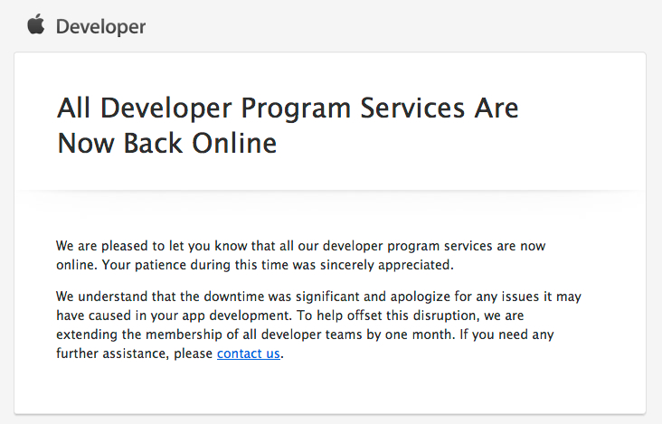 Apple si è resta conto dei problemi che ha determinato agli sviluppatori e decide di fare un passo verso di essi: «sappiamo che il tempo di stop di alcuni servizi è stato significativo – si legge ancora nel documento mandato via mail – e ci scusiamo per ogni problema che abbiamo involontariamente provocato al vostro programma di sviluppo. Per aiutare a superare questo disagio, abbiamo esteso un un mese l’iscrizione di tutti gli sviluppatori»