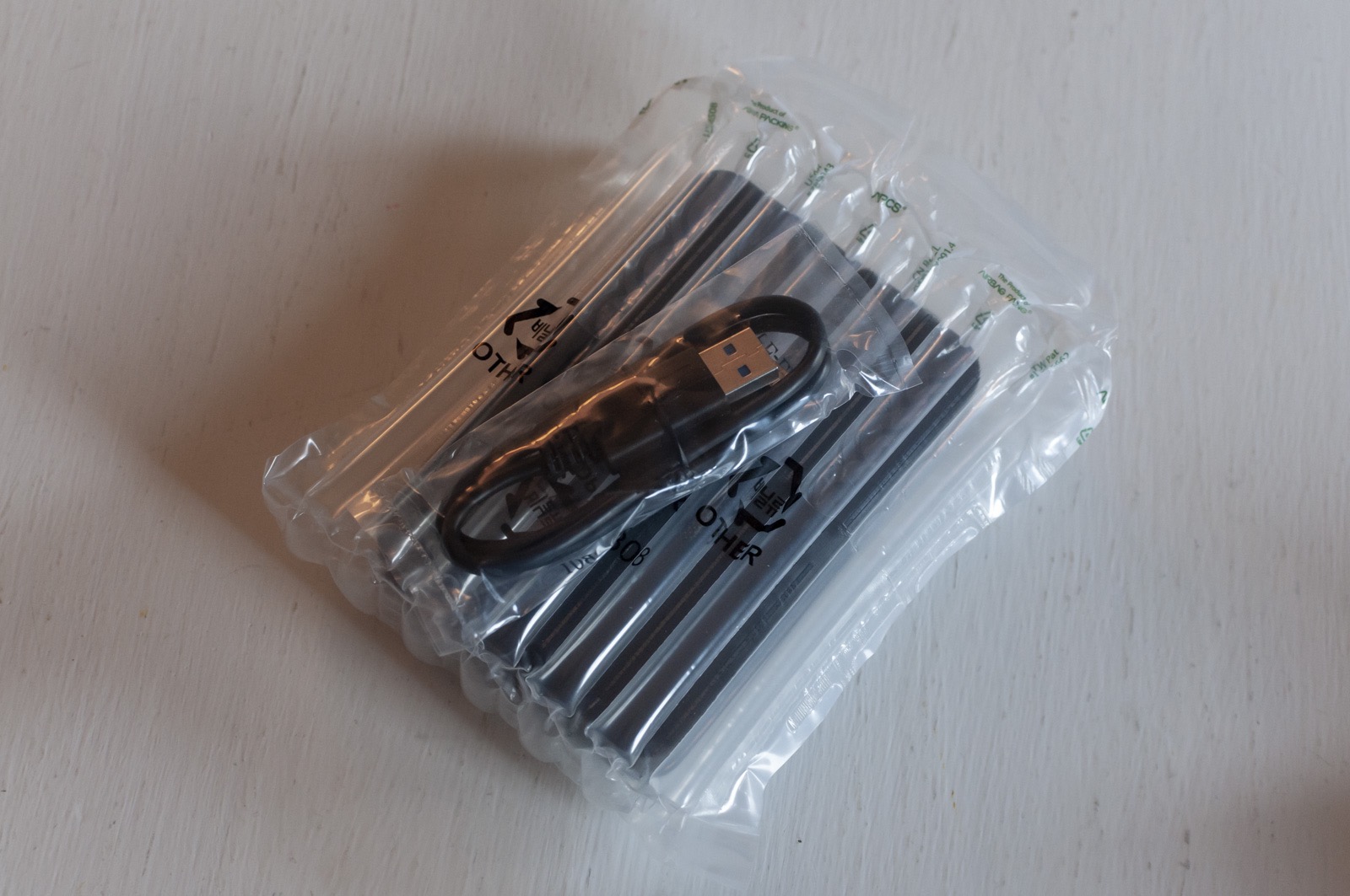 Una volta scartata la protezione, emerge il disco vero e proprio e un cavo USB-A/USB3.0.