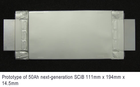 L’attuale batteria SCiB impiega un anodo all’ossido di litio titanio ed è apprezzata per sue caratteristiche di funzionamento in termini di sicurezza, durata estesa e caricamento rapido. Trova ampio impiego in veicoli e applicazioni industriali e infrastrutturali, compresi automobili, autobus, vagoni ferroviari, ascensori e centrali elettriche.